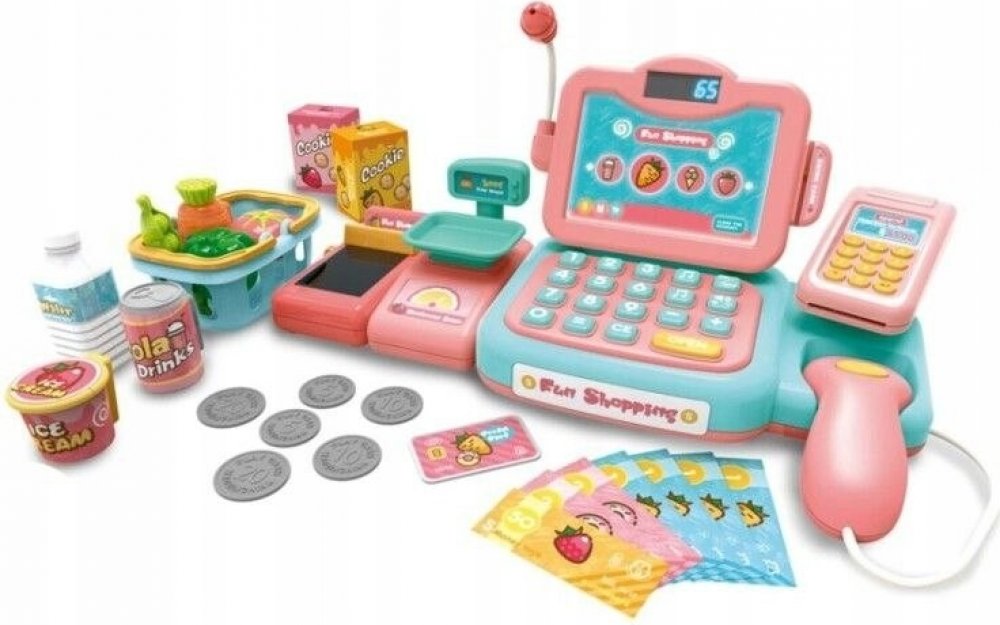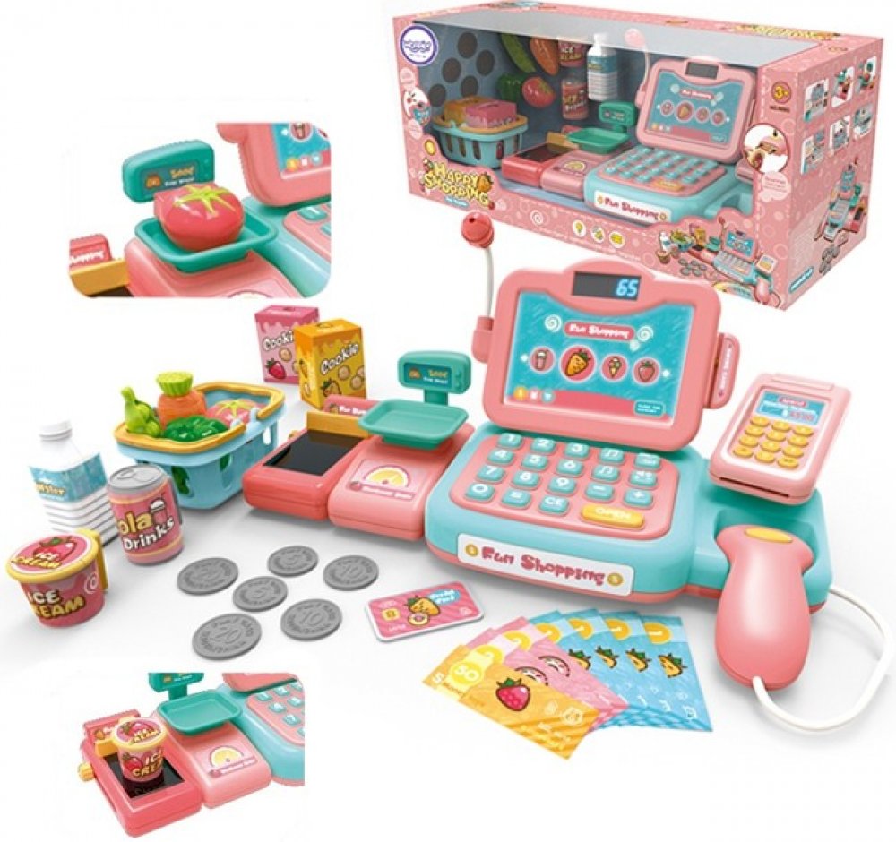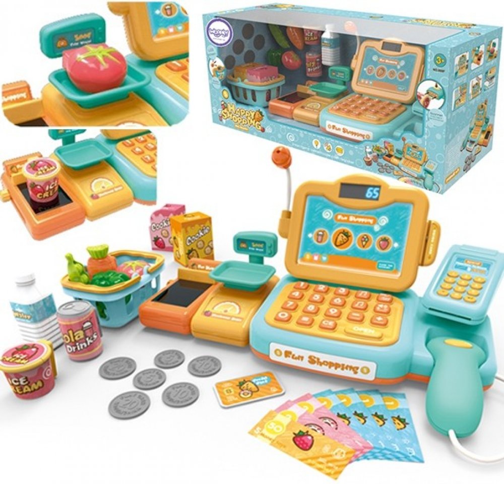 Pokladna obchodu s mnoha doplňky od Woopie je perfektní nápad pro děti starší 3 let . Hračka rozvíjí dětskou fantazii a povzbuzuje je ke kreativnímu myšlení . Děti si mohou vážit ovoce a zeleninu a následně je pomocí klávesnice plnit do pokladny. Děti pomocí čtečky naskenují balíček sušenek nebo láhev vody. Poté budou moci platit dvěma způsoby - klasicky penězi nebo platební kartou . To vše je sou...