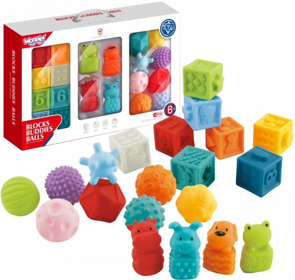 Tato sada smyslových kostek je určena pro děti od přibližně 6 měsíců. Každý z 20 dílků je měkký na dotek, při stisknutí vydává zvuk a nabízí různé textury, tvary, čísla, symboly a motivy zvířat a ovoce. Kostky lze mezi sebou spojovat, čímž je rozvíjena i jemná motorika dítěte. Hračka podporuje vnímání zraku a sluchu, smysl pro hmat, logické myšlení a přípravu na první počítání.