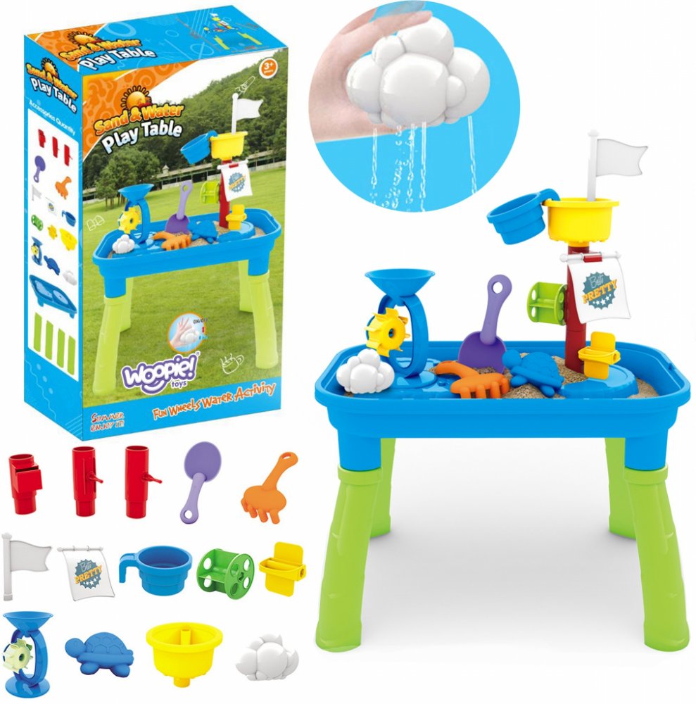 Stolní hračka od značky WOOPIE je ideální pro zábavu s vodou a pískem. Tento set nabízí mnoho zábavných doplňků jako formičky, hrabičky, lopatku a další. Díky kelímku může dítě nalévat vodu po stěžni a sledovat, jak se voda pohybuje po vodních mlýnech. Stolek je určen pro vnitřní i venkovní zábavu. Perfektní na doma stejně jako na pláž nebo do pískoviště.Vlastnosti:- vhodné od 3 let- 2v1 vodní stů...