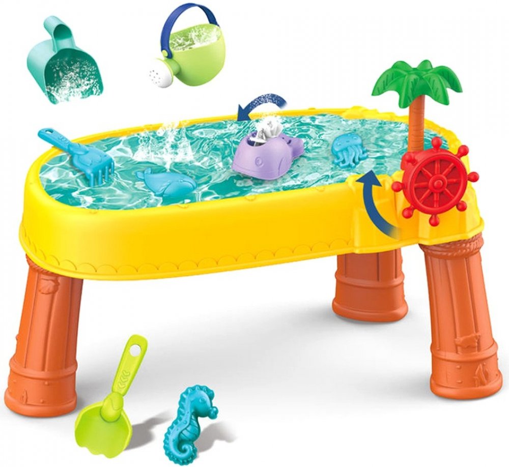 Stolek Sand Table od značky WOOPIE je ideální hračka pro hru s vodou a pískem . Sada obsahuje 8 doplňků : 3 formičky, rybičku, konev, nádobu s rukojetí, hrábě a lopatku. Stůl má volant , kterým můžete otáčet a cítit se jako skutečný pirát. Sada je určena pro vnitřní i venkovní hraní . Ideální pro hraní doma, na pláži nebo na pískovišti.