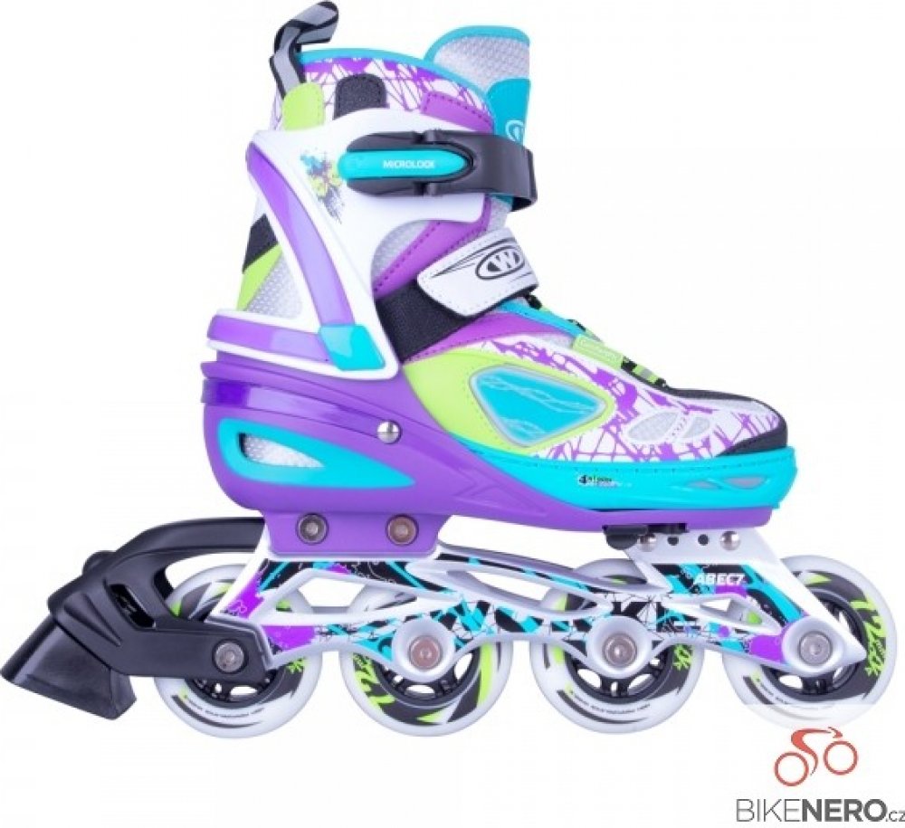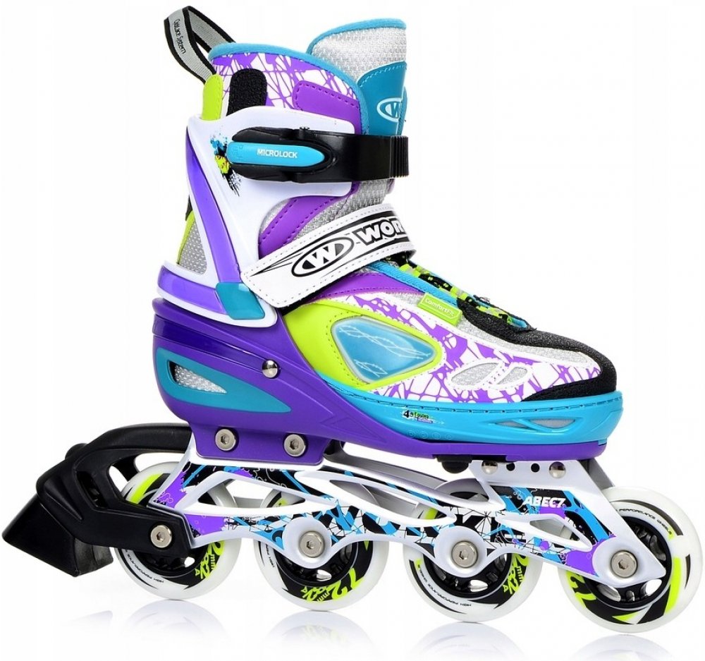 Nastavitelné kolečkové brusle WORKER Fizzo zaujmou výrazným pestrobarevným zpracováním, moderním designem a snadno regulovatelnou velikostí pomocí páčky na spodní straně bruslí. Odolný hliníkový podvozek, rychlostní ložiska ABEC 7 a kolečka vyrobená z polyuretanové gumy zajišťují příjemné jízdní vlastnosti.