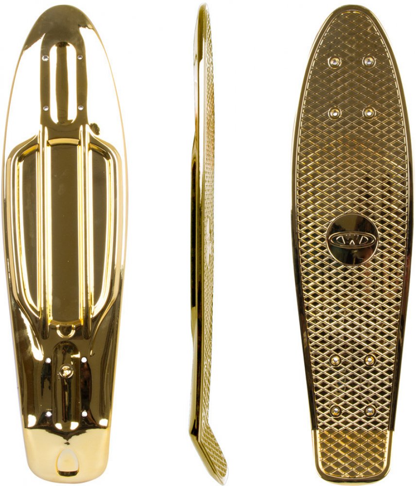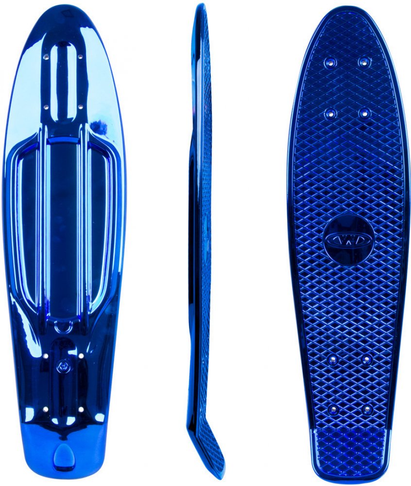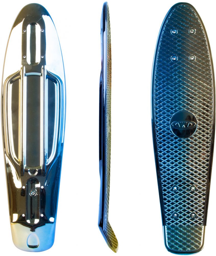 Polypropylenová kicktail deska pro penny board v lesklé chromové barvě, protiskluzové mřížkování na svrchní části.