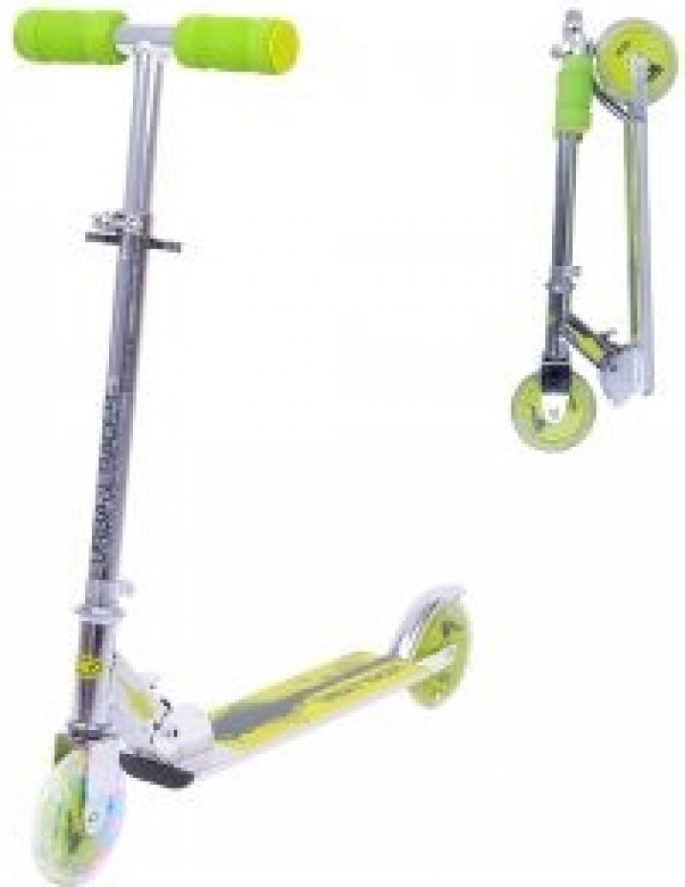 Koloběžka s nastavitelnou výškou řídítek, svítící kolečka, skládací protiskluzová opěrka nohou.