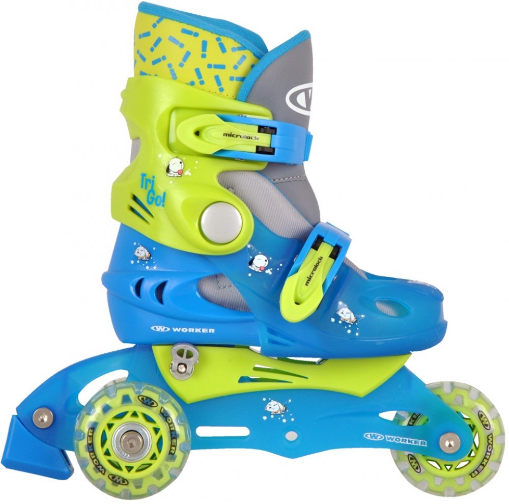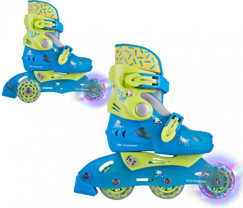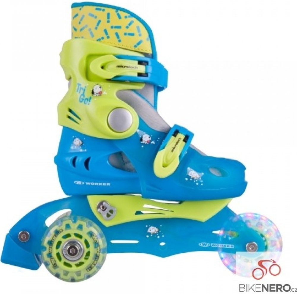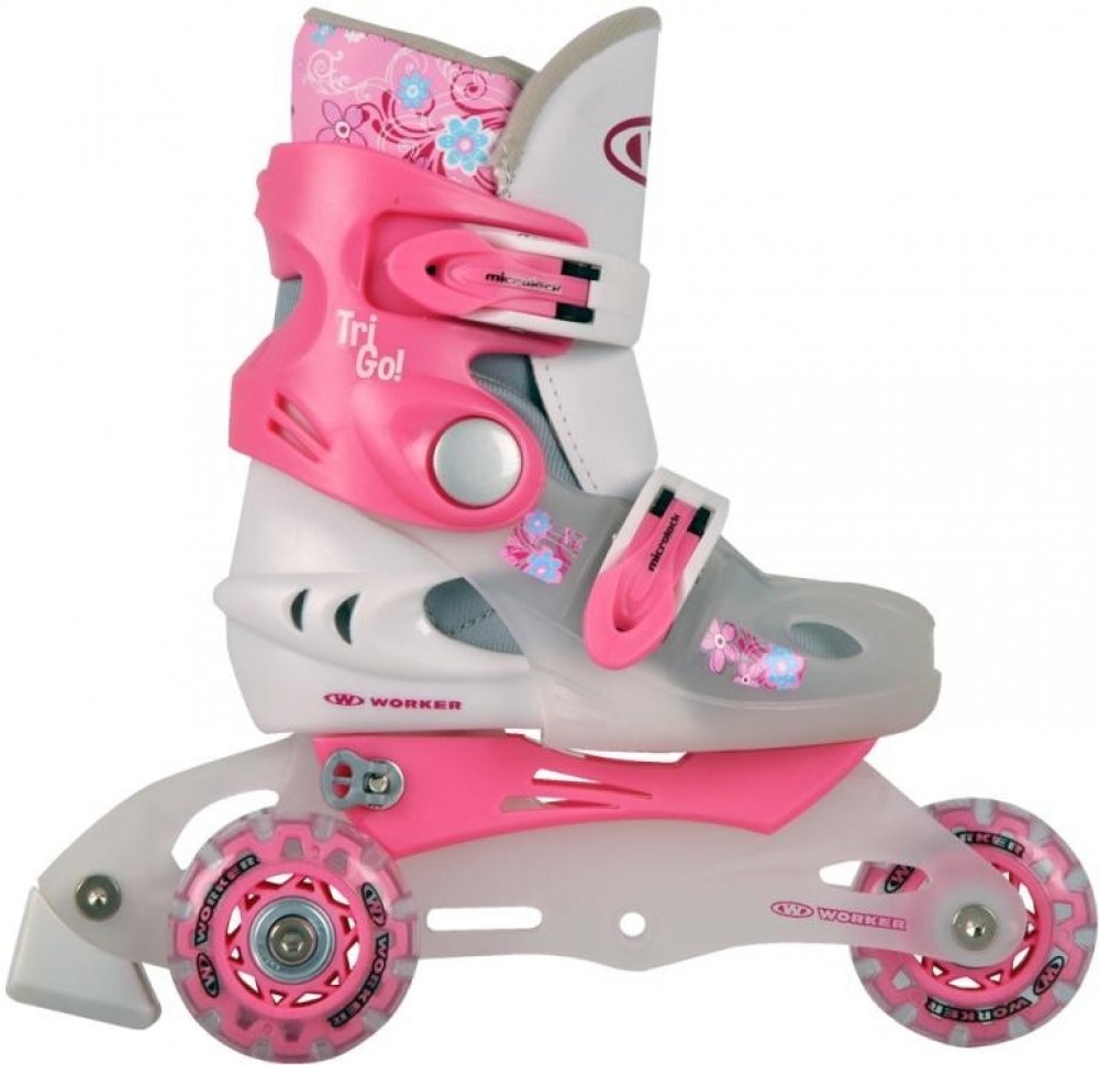 Dětské kolečkové brusle WORKER TriGo Skate jsou kvalitní dívčí brusle, které vynikají svou kvalitou a atraktivním designem. Dětské kolečkové brusle splňují nejvyšší standard provedení bezpečnosti podléhající nejpřísnějším evropským normám EN-71 německé zkušebny TÜV-GS Bota brusle je vyrobena z kvalitních tvrzených materiálů, které jsou velmi odolné, anatomicky tvarované a mají vnitřní polstrování. Dvě přezky Microlock v oblasti kotníku a nártu zaručují maximální stabilitu nohy během jízdy. Dětské kolečkové brusle WORKER TriGo Skate mají díky nastavitelné velikosti univerzální využití. Tomu přispívá i možnost uspořádání koleček Tri-skate (dvojice zadních koleček zajišťující lepší stabilitu) nebo In-line (tři kolečka v řadě). Mezi další přednosti dětských bruslí patří polyuretanová kolečka, která lépe absorbují nárazy, což zaručuje vyšší komfort během jízdy. Díky těmto výborným vlastnostem se staly dětské kolečkové brusle WORKER TriGo Skate velmi oblíbeným modelem dětských bruslí.