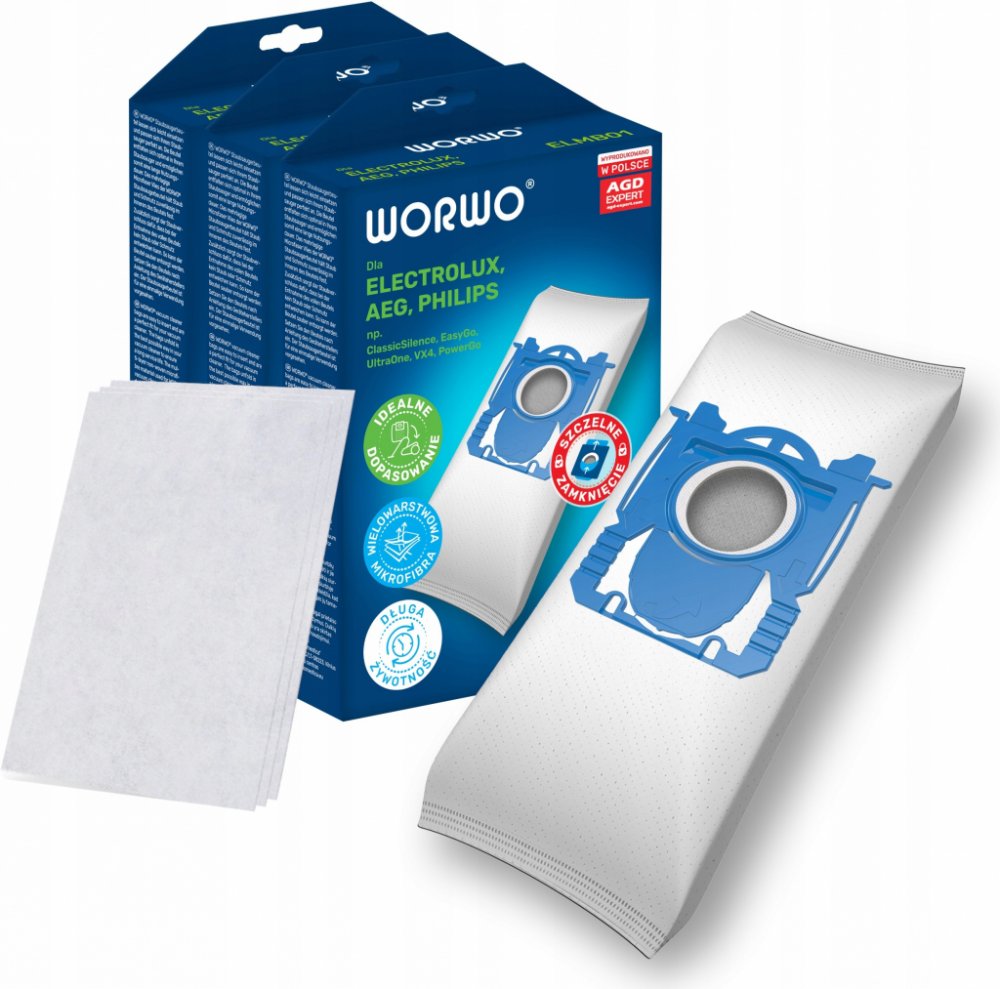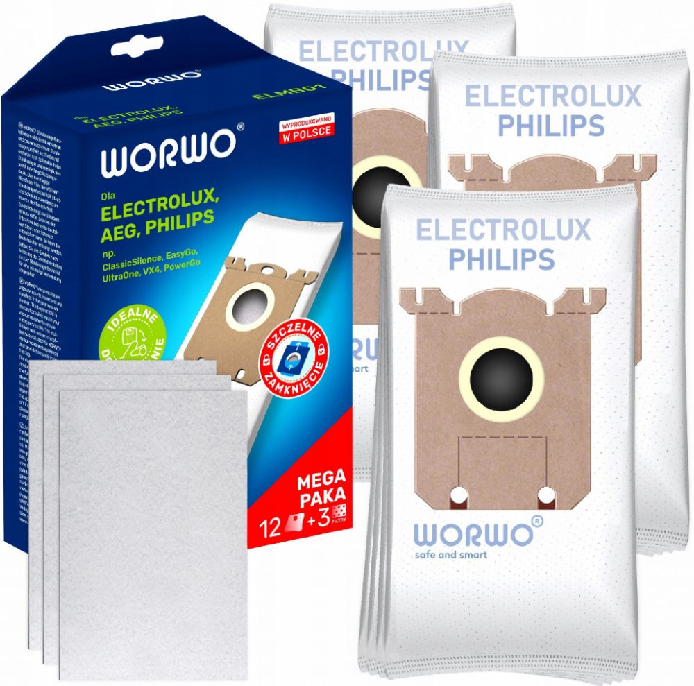 12 x SÁČKY WORWO ELMB01 DO VYSAVAČE + 3 x VSTUPNÍ FILTR