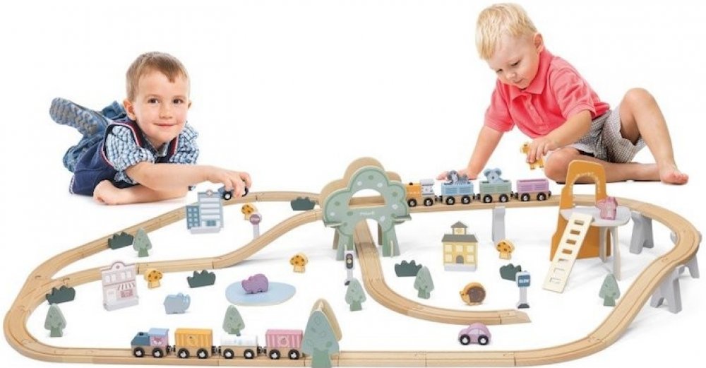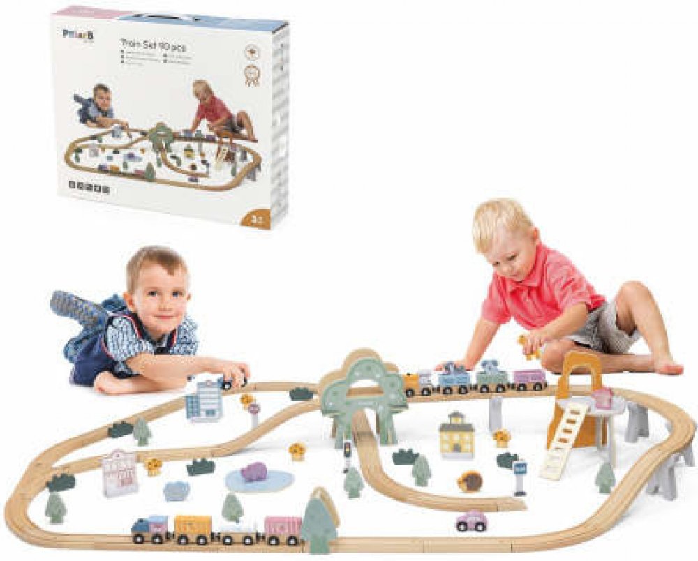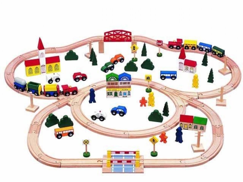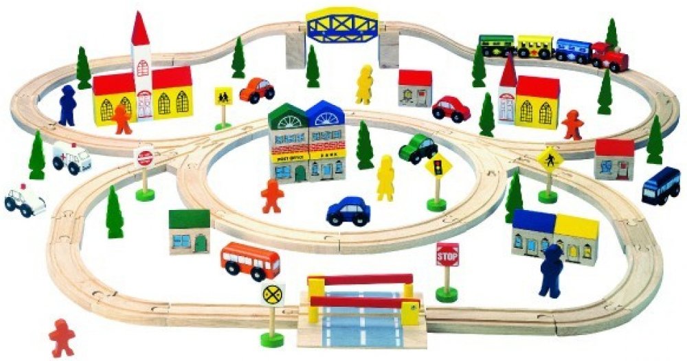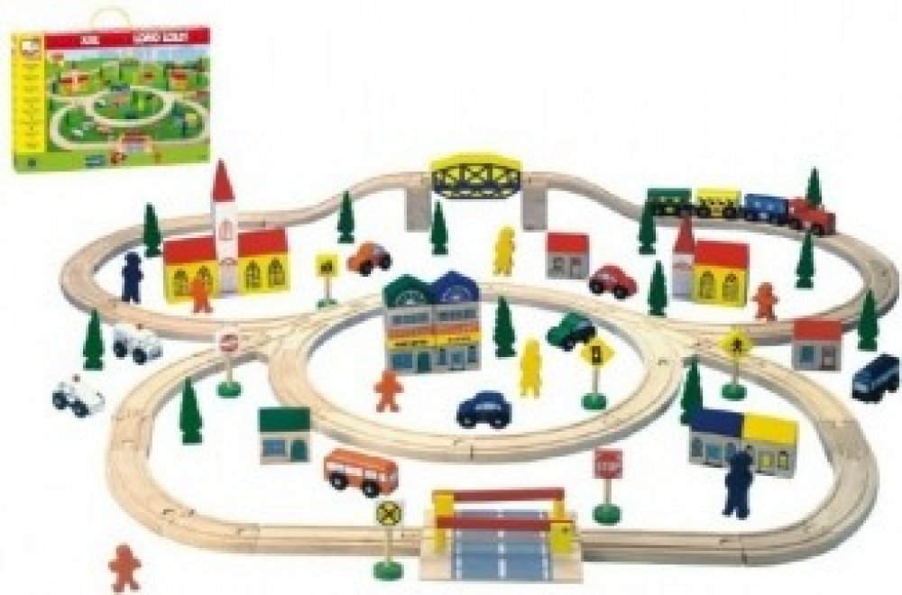 Obsahuje: 100 kusů (kolejnice + jejich příslušenství a doplňky jako jsou značky, domečky, autíčka, panáčci a stromky)