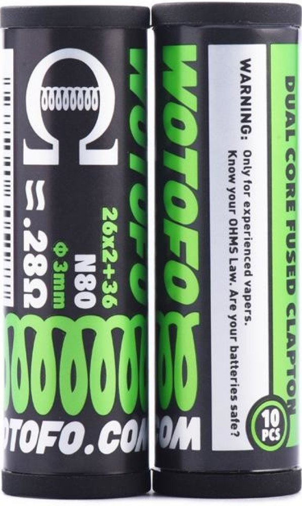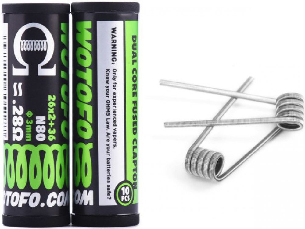 Předmotané spirálky předního výrobce WOTOFO o celkovém odporu 0,28ohm Fused Clapton spirálky jsou vyrobeny z materiálu Ni80, který zajišťuje rychlý náběh žhavení. Díky větší odpařovací ploše produkují větší mraky páry, ale také chuť nezůstává pozadu.