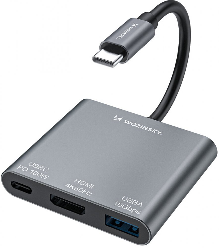 Hub Wozinsky WHCH-01 USB-C PD 100W HDMI 4K@30Hz USB-A 10Gbps - šedý Rozbočovač Wozinsky WHCH-01 je kompaktní, ale výkonné řešení, které vylepšuje možnosti vašeho notebooku nebo tabletu. Je vybaven třemi porty a nabízí rychlý přenos dat rychlostí 10 Gb/s, napájení 100 W a podporu videa v rozlišení 4K při 30 Hz přes HDMI. Hliníkové pouzdro zajišťuje lepší odvod tepla a provozní stabilitu, zatímco dí...