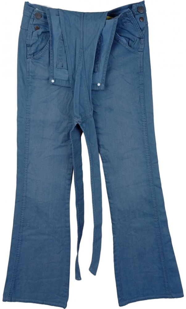 Charakteristickým znakem je střih flare – rozšířené nohavice od kolen dolů, které opticky prodlužují postavu a skvěle se hodí k botám na podpatku i teniskám. V pase najdete klasické zapínání na knoflík a zip, doplněné o praktické poutka na pásek a ozdobný textilní pásek.