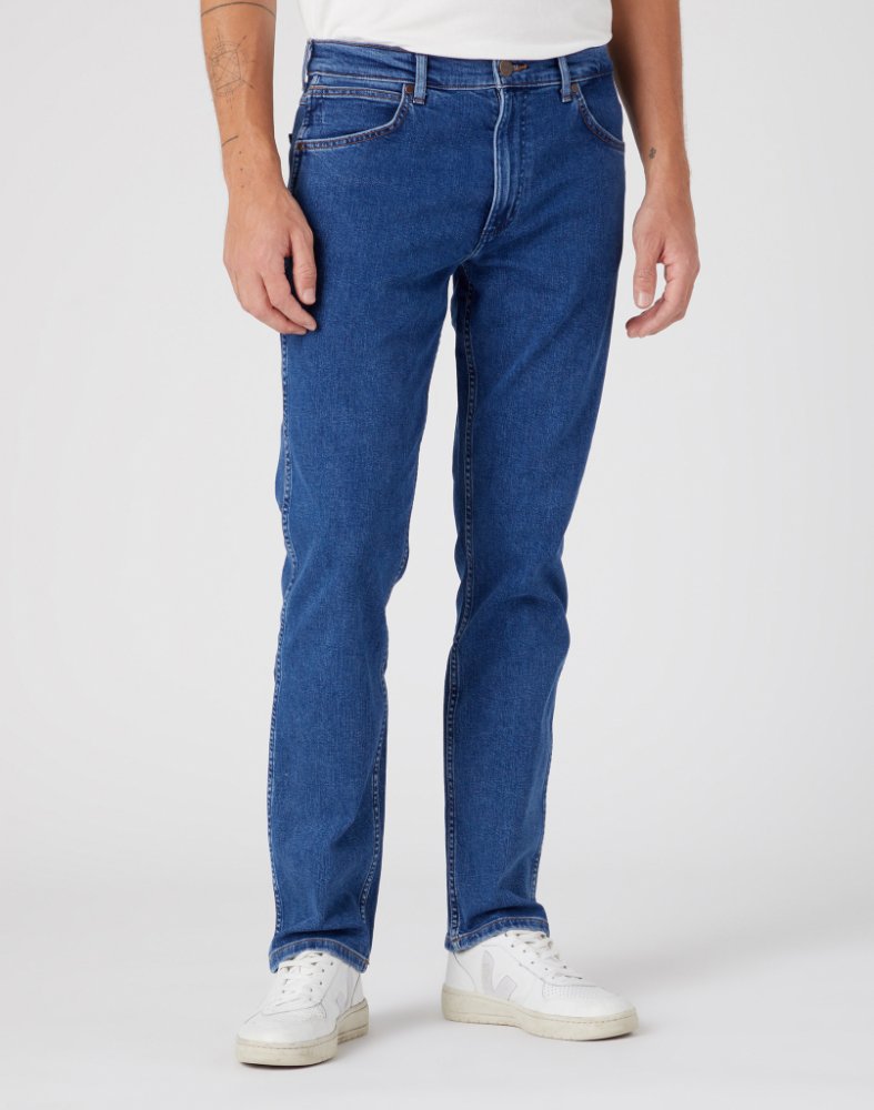 Středně modré džíny v moderním střihu GREENSBORO - klasický rovný, moderní a pohodlný střih se zapínáním na zip. Zaujmou dokonalou džínovou úpravou. Zapínání na zip a knoflík, na kterém je logo WRANGLER. Přední kapsy jsou zdobeny plochými nýty. Zadní kapsy mají typické dvojité prošití ve tvaru W. Levá kapsa má kožený štítek s logem WRANGLER. Velmi povedené džíny, které unosíte řadu let