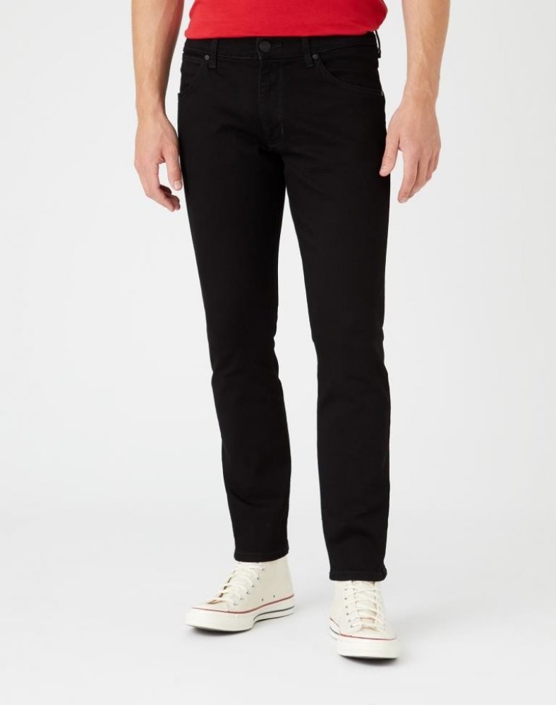 Moderní džíny úzkého střihu Larston s nižším sedem. Díky tomu, že nohavice jsou na stehnech volnější a ke kotníkům se postupně zužují, jsou kalhoty velmi pohodlné. Jsou vyrobeny z příjemného černého denimu o střední gramáži, prošity nití v černém tónu a mají mosazné nýty a knoflík. Na zadních kapsách jeans je ozdobné originální „W“ vyšívání, na pravé zadní kapse také kožená nášivka s logem Wrangle...
