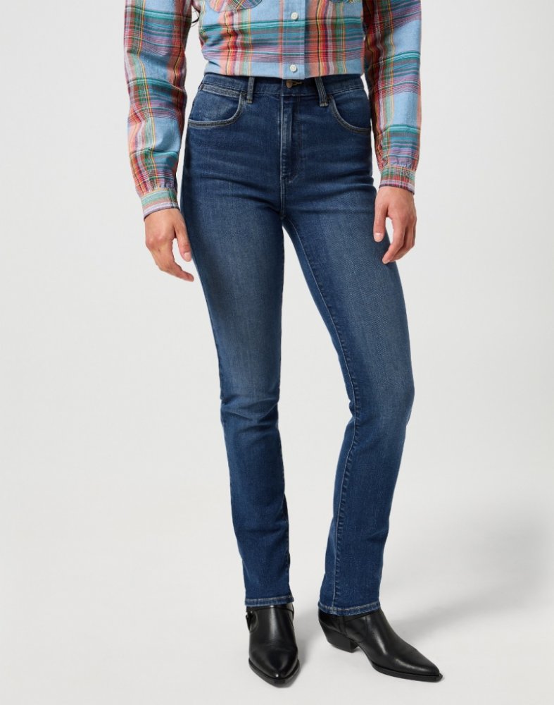 Dámské džíny Wrangler tmavšího odstínu modré barvy ve střihu SLIM. Materiál je ve střední gramáži. Tyto jednoduché a elegantní jeans dokonale kopírují tvar dámské postavy a jsou oblíbené především díky úzkým nohavicím až ke kotníkům a vysokému pasu.