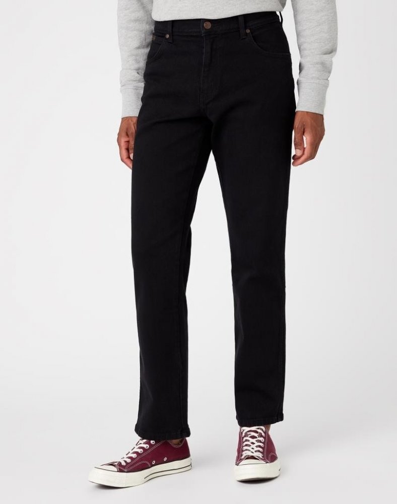 Elegantní a moderní černé džíny ve střihu TEXAS se zapínáním na zip nesmí chybět ani u Vás. Kalhoty jsou typické pevným materiálem, černým prošitím a mosazným knoflíkem a nýty na předních kapsách. Prošití na zadních kapsách je, jak je u značky zvykem, dvojité ve tvaru W a v barvě, která ladí s barvou kalhot. Na zadní kapse je kožená nášivka s logem značky WRANGLER a zároveň i na přední vnitřní kapse na mobilní telefon je štítek s logem značky. Džíny obsahují 2% příměs elastanu, díky čemuž jsou rifle velmi pohodlné při nošení. Jsou vhodné jak ke světlým a kontrastním tričkům, tak i elegantní košili.