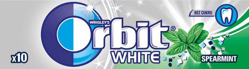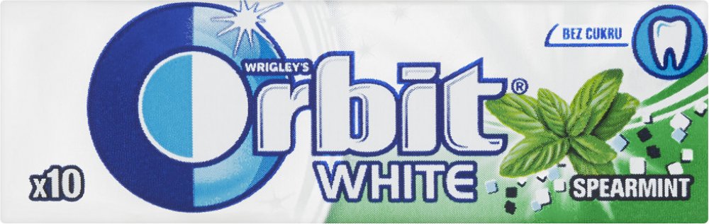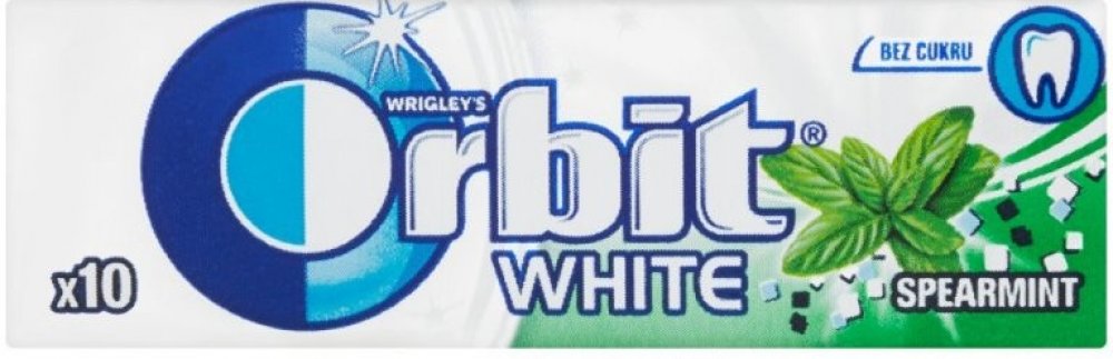 Žvýkačka bez cukru Orbit s mátovou příchutí a s obsahem speciálních bělících mikrogranulí.