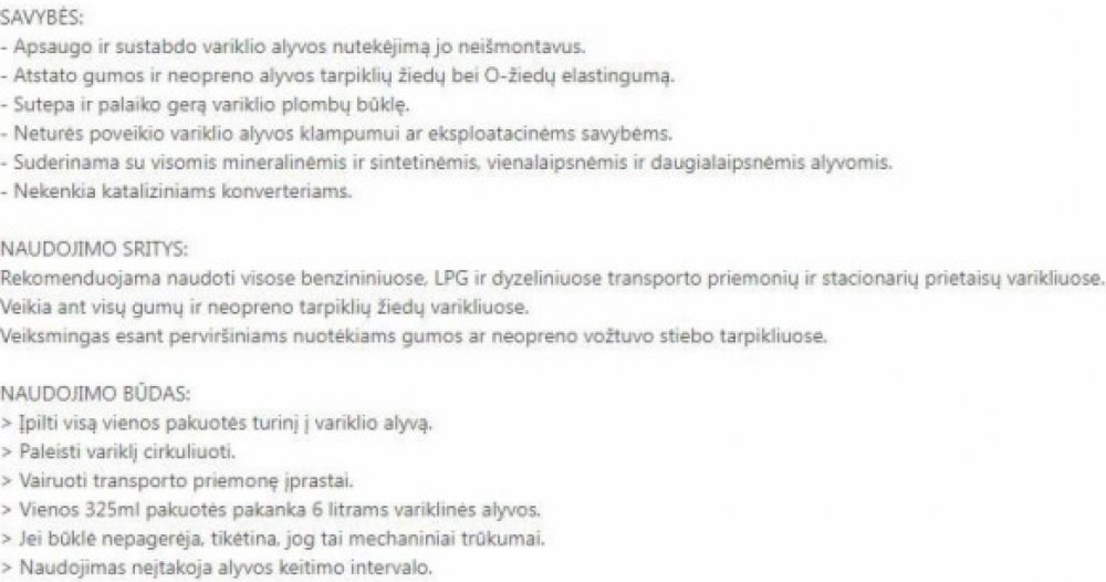 Unikátní přísada do motorového oleje, navržená k zastavení úniků a kapání oleje, které mohou vzniknout v důsledku vysychání a smršťování neoprenových a gumových těsnění a O-kroužků. Tuto přísadu lze použít ve všech benzínových, naftových a LPG motorech vozidel i stacionárních strojů.