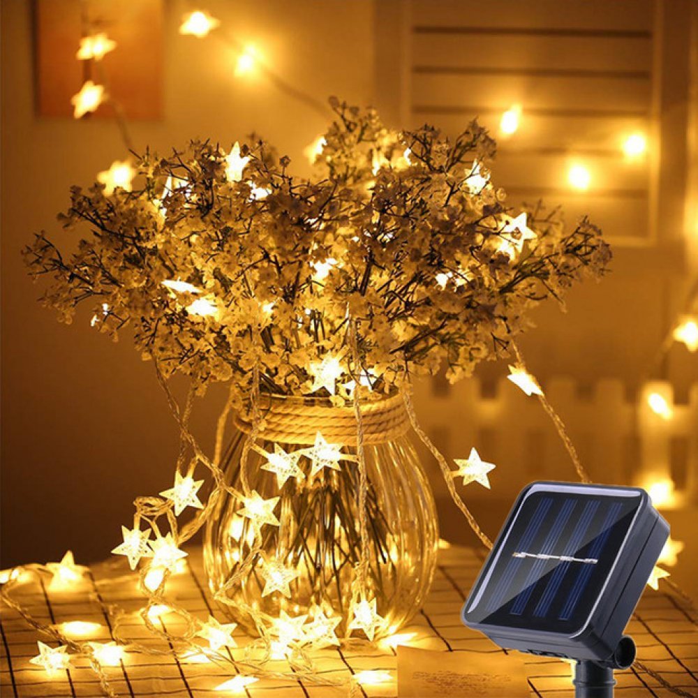 LED světelný řetěz s světly ve tvaru hvězdy, snadno tvarovatelný. Voděodolný. Solární napájení s možností zapíchnutí solárního panelu do hlíny. Po uplném nabití vydrží svítít až 10h.