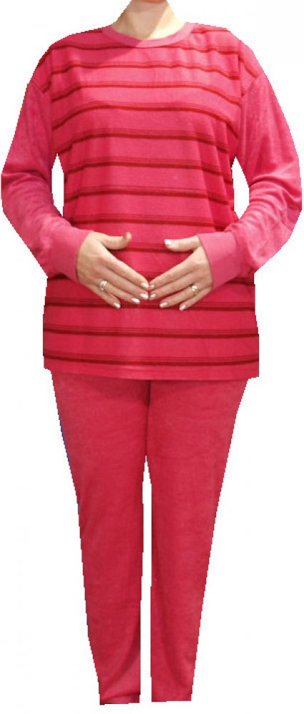 Dámské pyžamo froté hřejivé je barvy tmavě růžové. Froté pyžama mají horní díl ukončen na rukávu s náplety, spodní díl je rovně ukončen. Pyžama jsou větší, při objednání doporučujeme objednat velikost o 1 číslo menší. Pyžamo je ukončené u krku výstřihem O . Kalhoty jsou v pase na pružnou gumu.