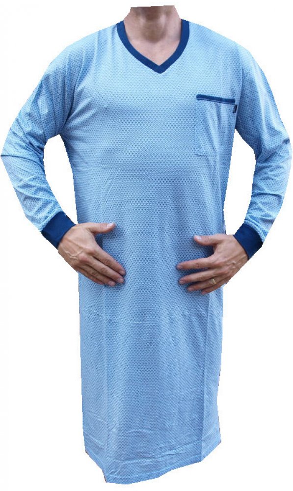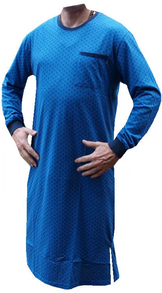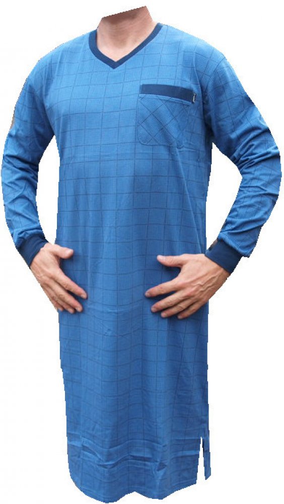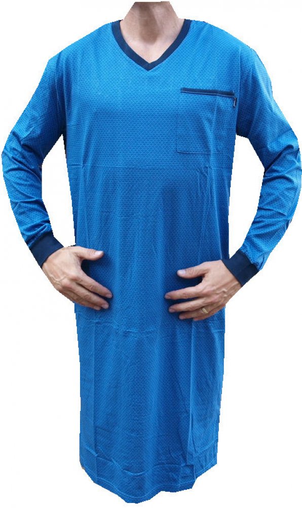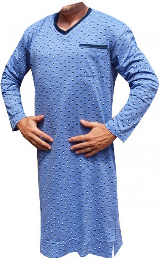 Pánská noční košile s dlouhým rukávem je vyrobena z materiálu 100% bavlna. Noční košile má dlouhý rukáv s náplety a výstřih u krku do V, na pravé straně je kapsička. Noční košile je barvy modé s drobným vzorkem.