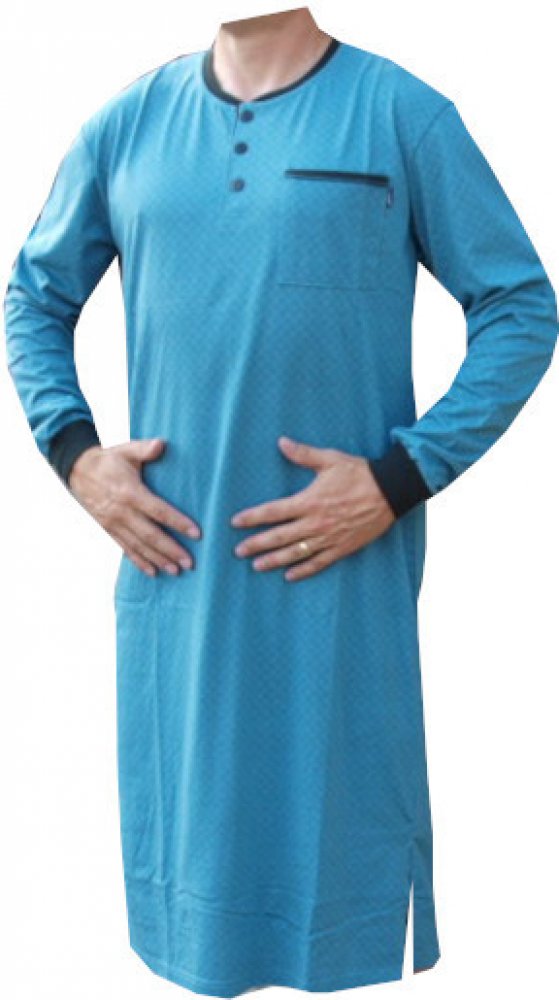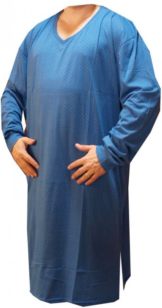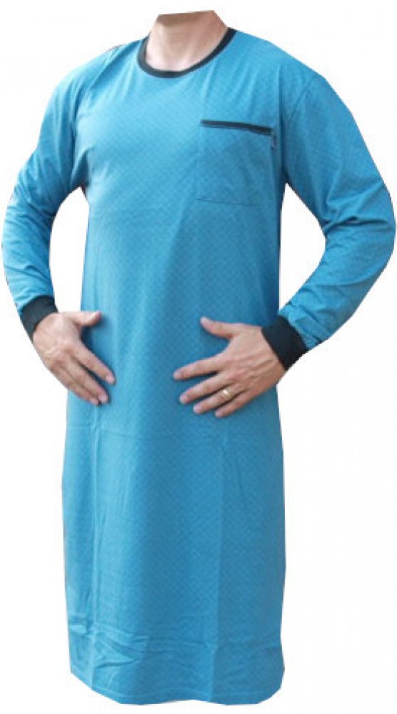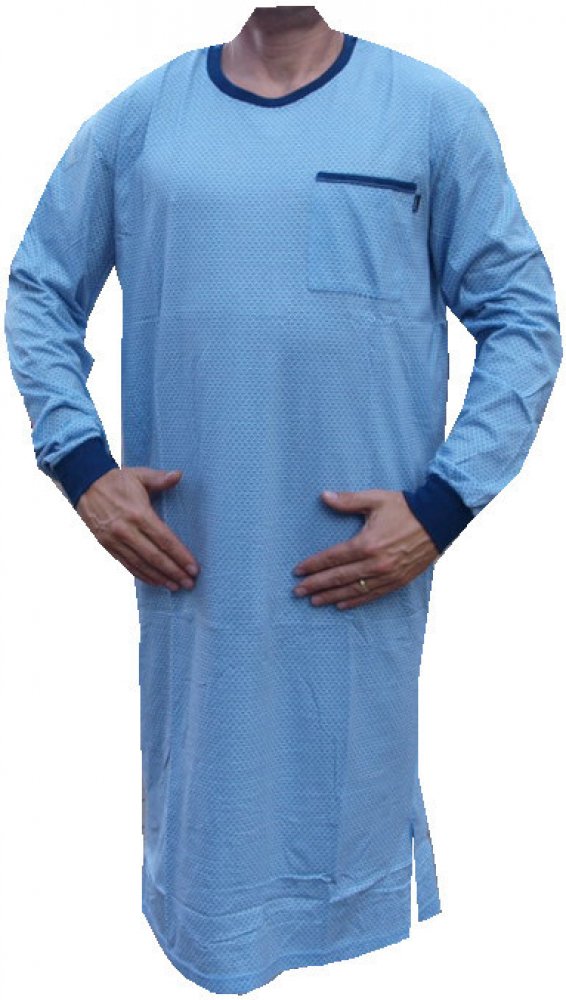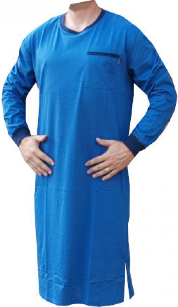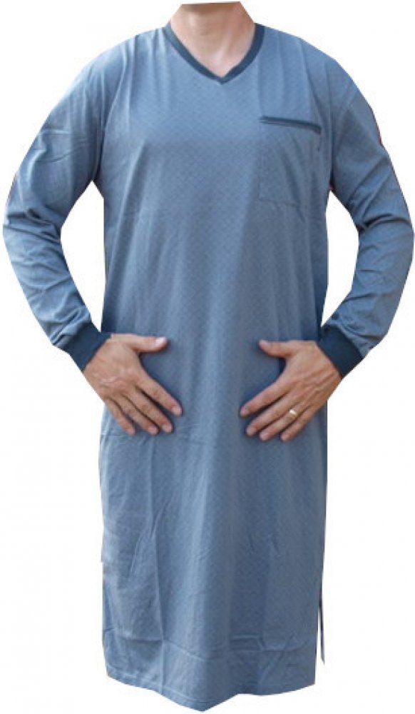 Pánská noční košile s dlouhým rukávem je vyrobena z materiálu 100% bavlna. Noční košile má dlouhý rukáv s náplety a výstřih u krku do V, na pravé straně je kapsička. Noční košile je barvy modé s drobným vzorkem.