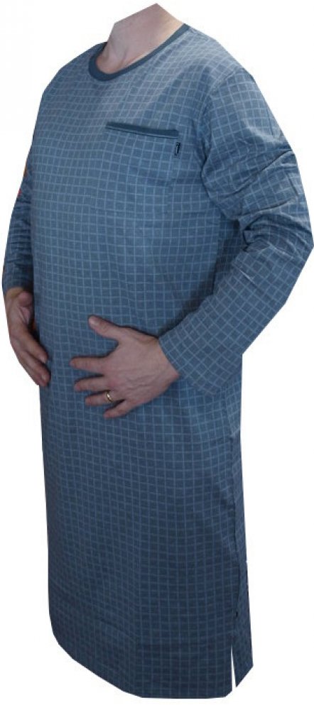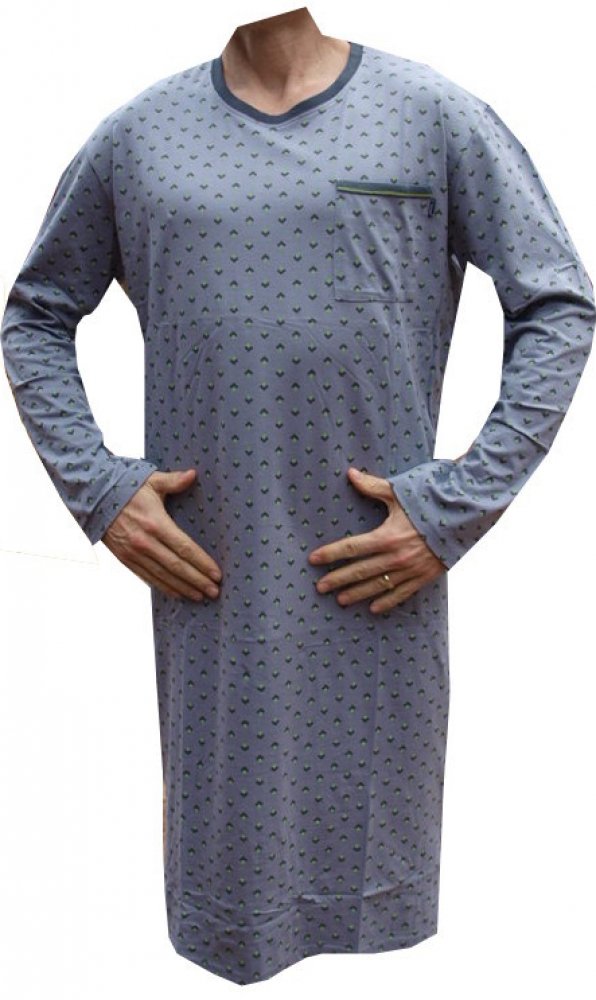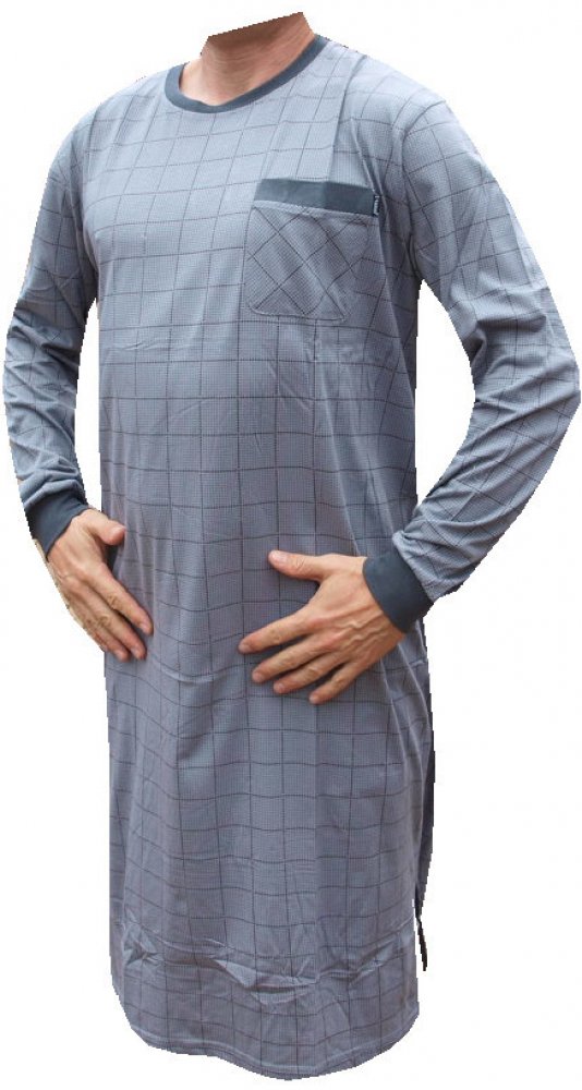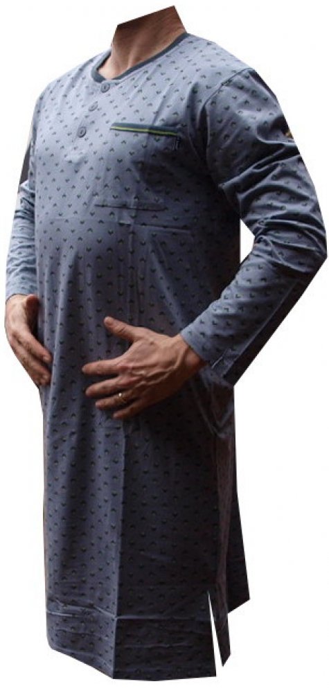 Pánská noční košile s dlouhým rukávem je vyrobena z materiálu 100% bavlna. Noční košile má dlouhý rukáv a výstřih u krku do O se třemi knoflíčky, na pravé straně je kapsička. Noční košile je barvy šedé s drobným vzorkem.