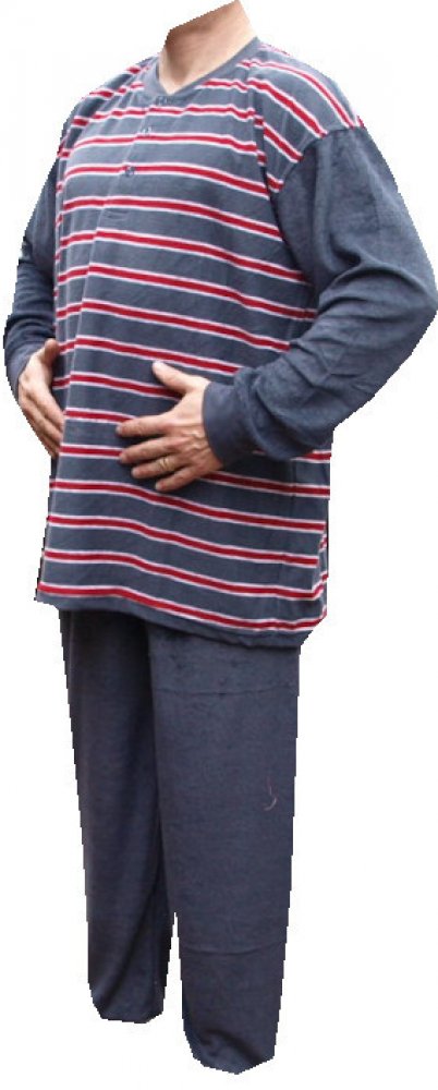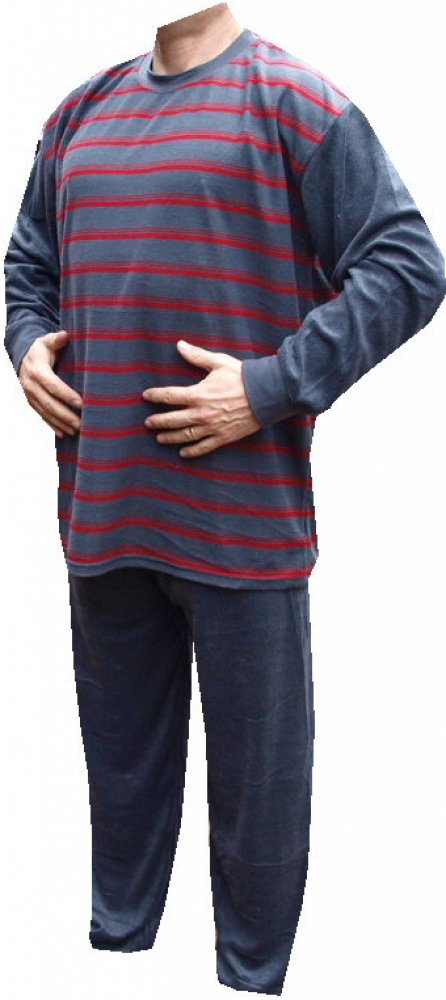 Pánské pyžamo froté hřejivé je barvy šedé. Froté pyžama mají horní díl ukončen na rukávu s náplety, spodní díl je rovně ukončen. Pyžama jsou větší, při objednání doporučujeme objednat velikost o 1 číslo menší, než je velikost požadovana. Pyžamo je ukončené u krku výstřihem O . Kalhoty jsou v pase na pružnou gumu.
