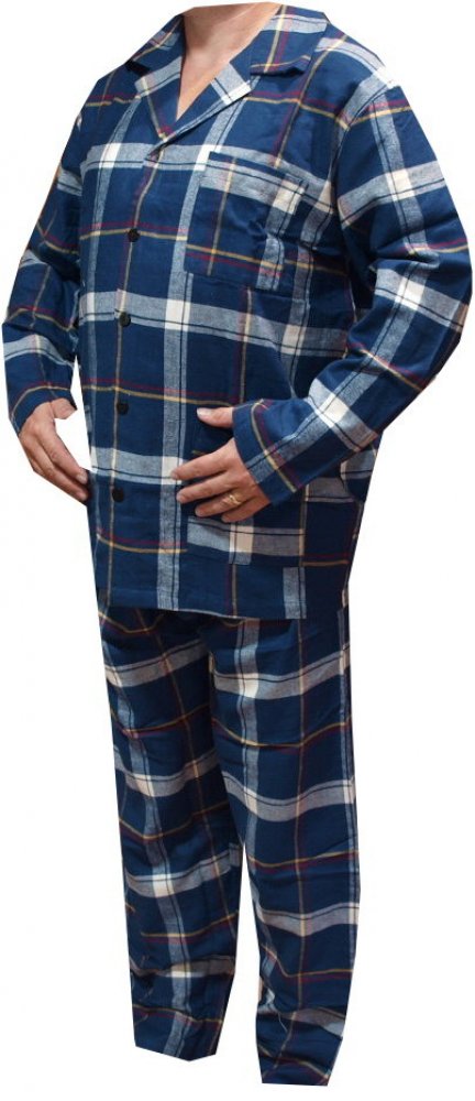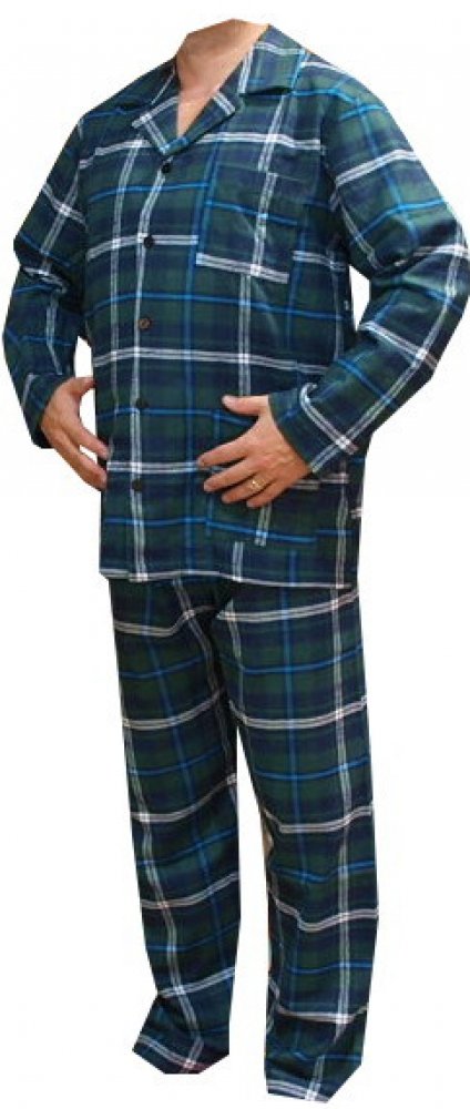 Pyžamo flanelové zelené barvy rozepínací je vyrobené z materiálu bavlna 100%. Pyžamový kabátek má v dolní části a na levé horní straně kapsy. Kalhoty jsou v pase na pružnou gumu.