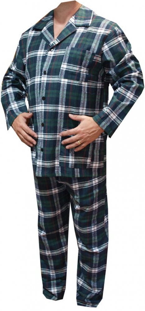 Pyžamo flanelové modrozelené barvy rozepínací je vyrobené z materiálu bavlna 100%. Pyžamový kabátek má v dolní části a na levé horní straně kapsy. Kalhoty jsou v pase na pružnou gumu.