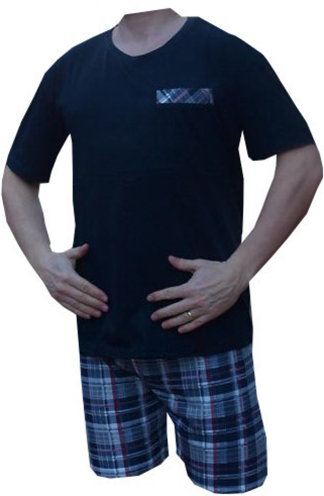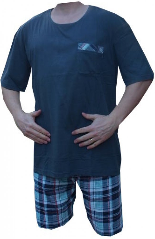 Pánské pyžamo bavlněné s krátkou nohavicí je vyrobeno ze 100% bavlny. Výstřih u krku je do O. Pyžamový kabaték má na levé horní straně kapsičku. Pyžama jsou barvy tmavě modré.