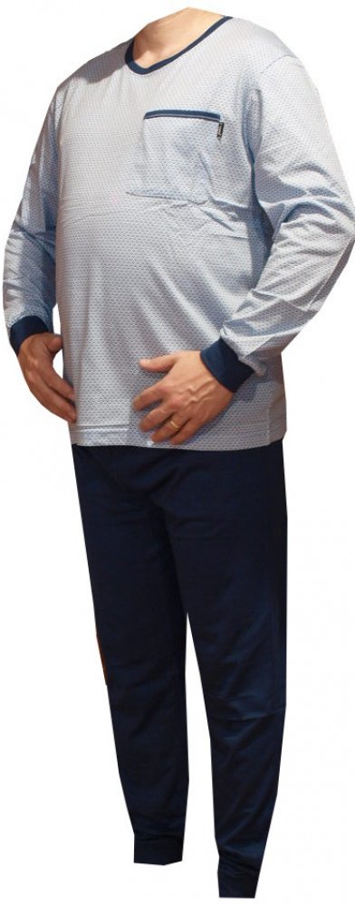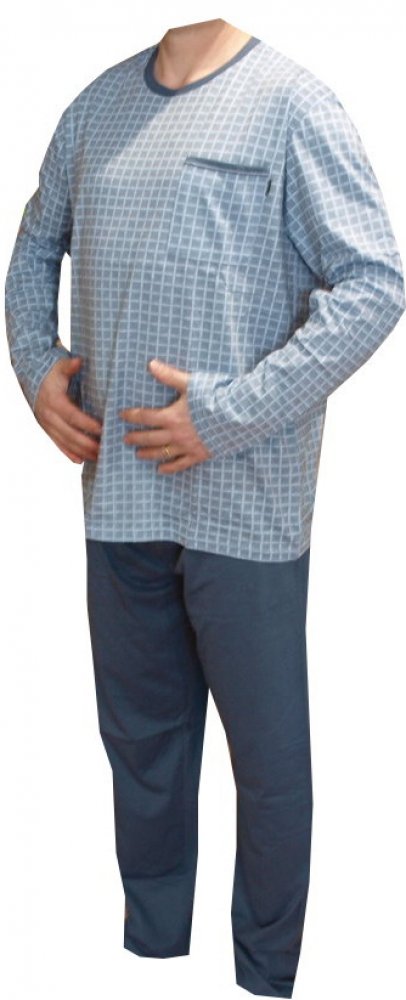 Pánské pyžamo bavlněné je barvy modré vyrobené z materiálu bavlna 100%. Pyžamový kabátek má v levé horní části kapsičku, Pyžamo je ukončené u krku výstřihem O, rukávy jsou ukončené do nápletu. Kalhoty jsou v pase na pružnou gumu.