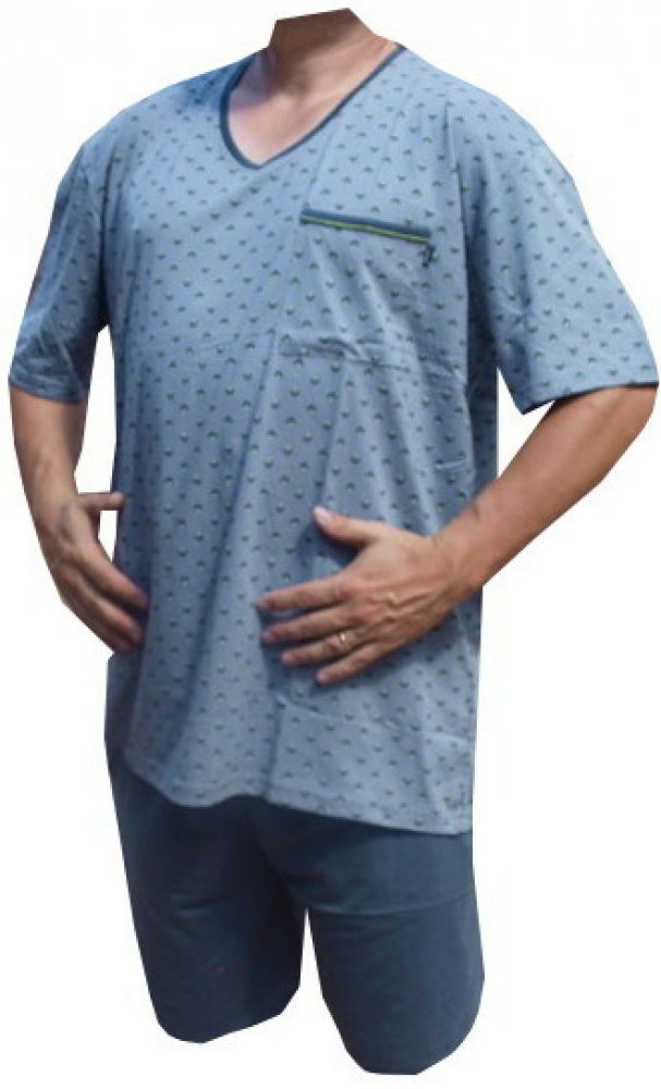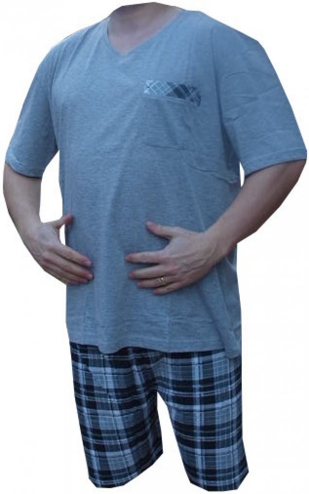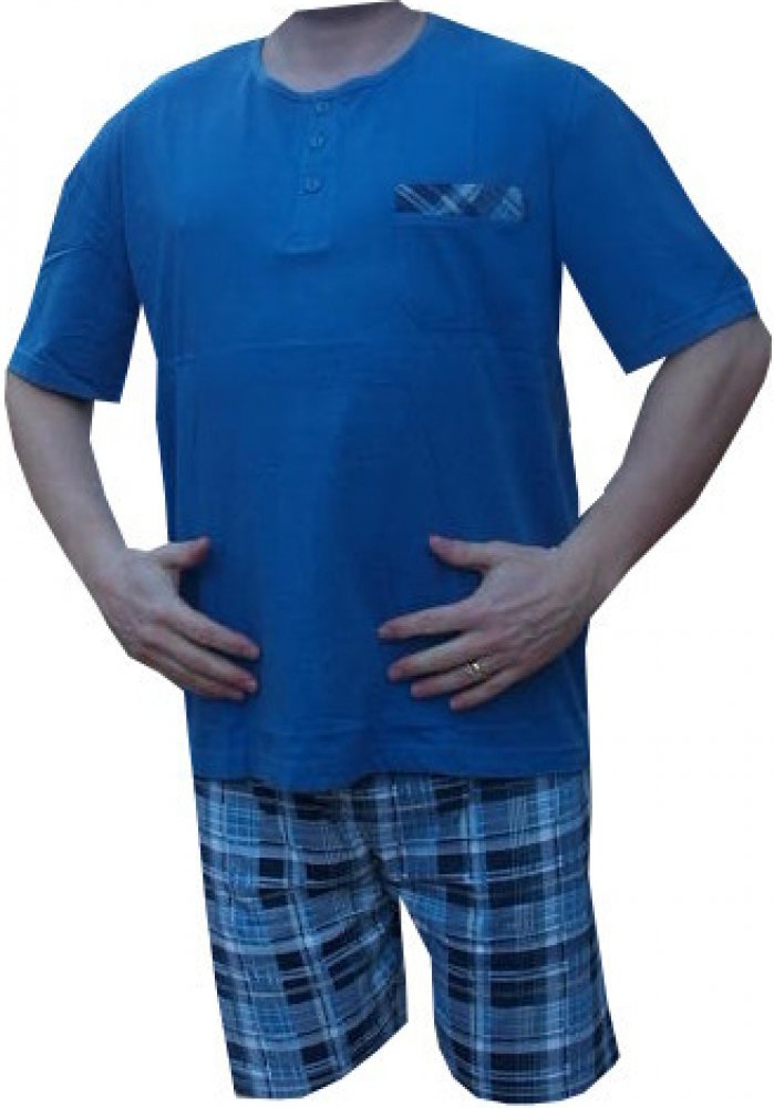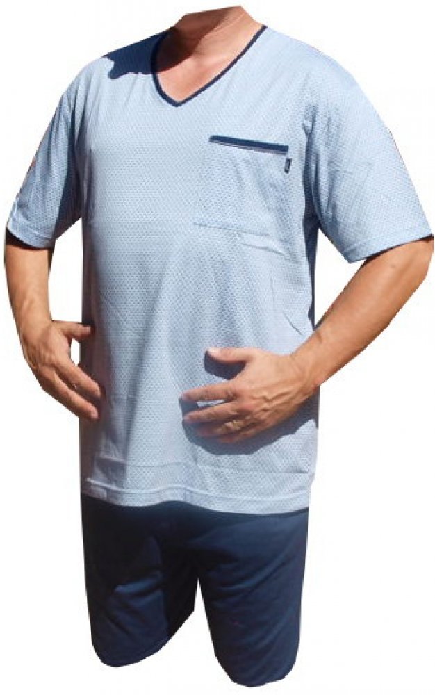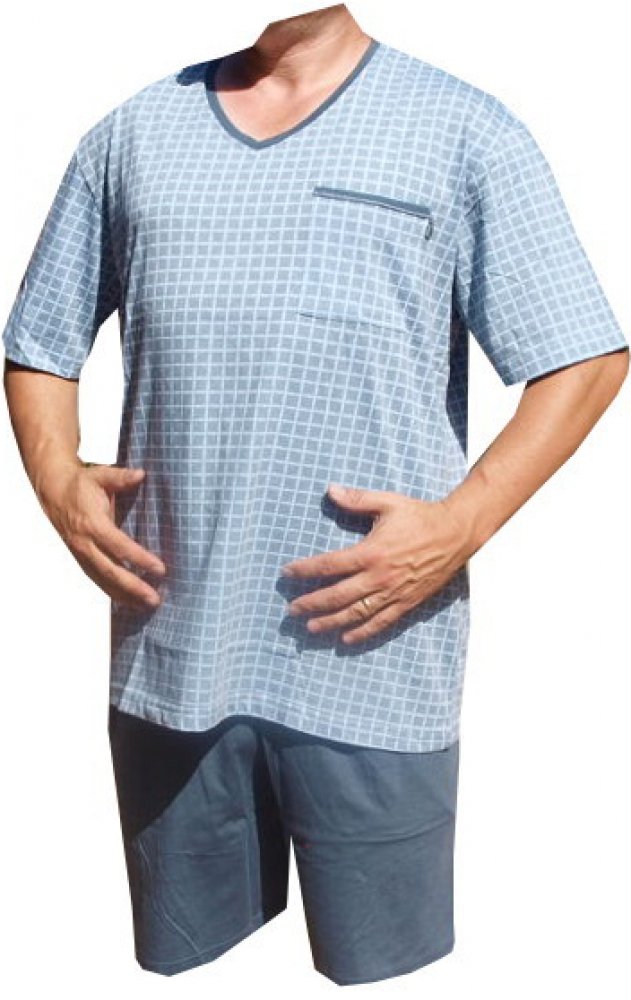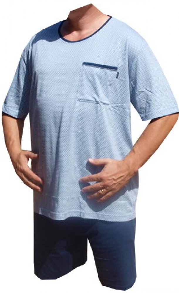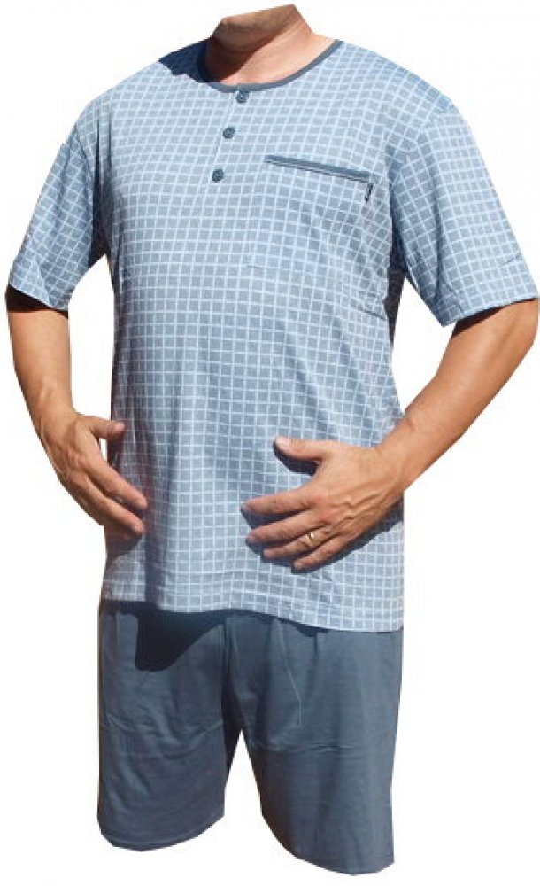 Komplet - pyžama bavlněné s krátkou nohavicí jsou vyrobené ze 100% bavlny. Výstřih u krku je do O. Pyžamový kabaték má na levé horní straně kapsičku. Pyžama jsou barvy světle modré s kostičkou.