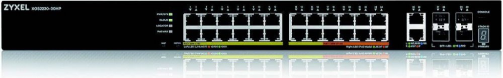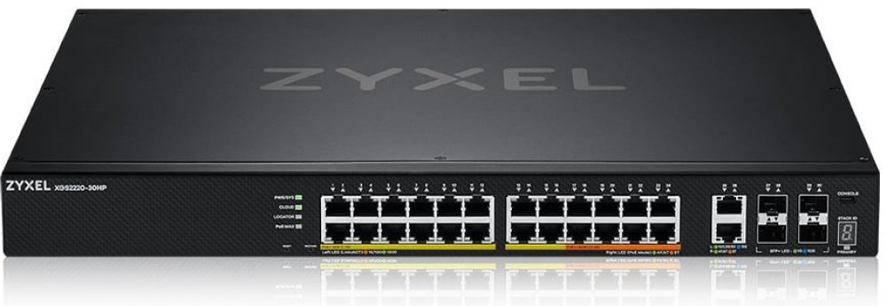Zyxel XGS2220-30HP. Typ přepínače: Řízený, Přepínač vrstev: L3. Typy přepínaných ethernetových portů RJ-45: Gigabit Ethernet (10/100/1000), Počet přepínaných ethernetových portů RJ-45: 24, Počet instalovaných modulů SFP+: 4. Tabulka MAC adres: 32000 pol., Kapacita přepínání: 168 Gbit/s. Síťové standardy: IEEE 802.1Q, IEEE 802.1ab, IEEE 802.1p, IEEE 802.1x, IEEE 802.3ab, IEEE 802.3ae, IEEE 802.3af,.... Podpora napájení po Ethernetu (PoE). Instalace do racku