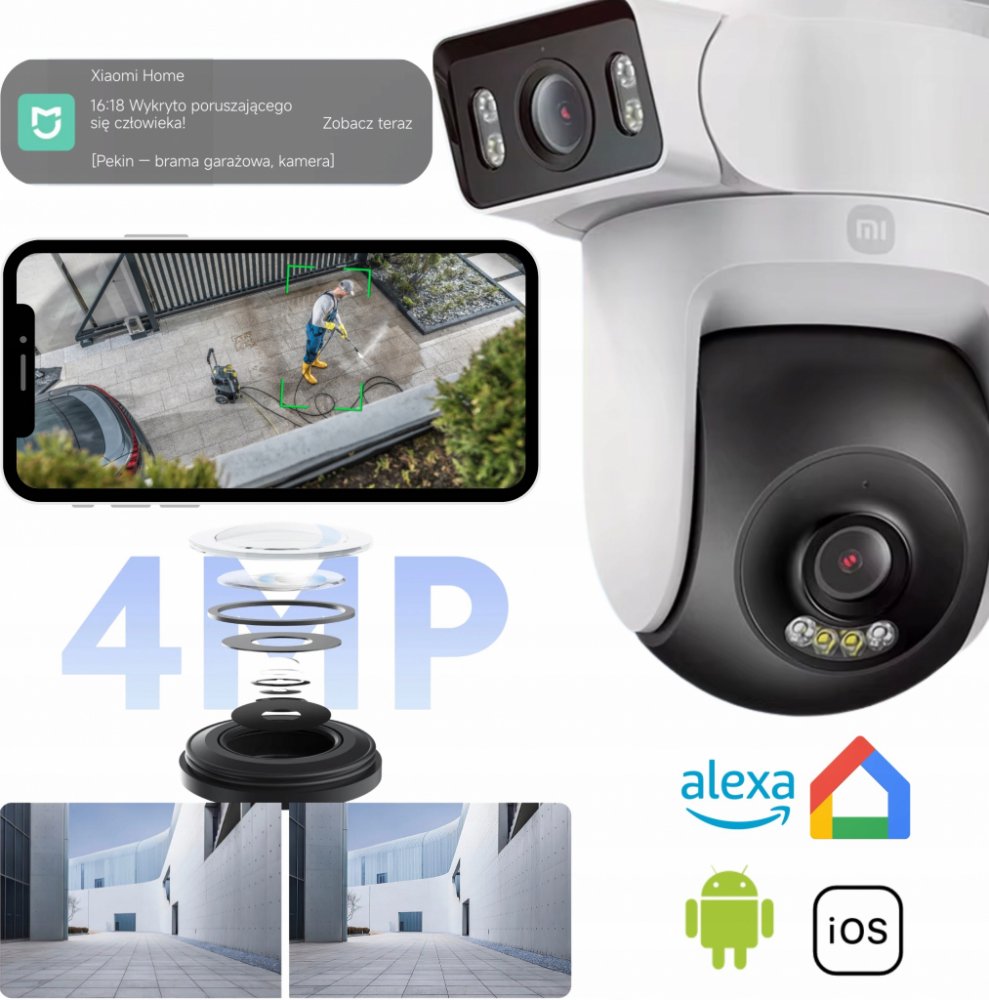 Xiaomi Outdoor Camera CW500 Dual kombinuje kameru s fixním pozorovacím úhlem, jejíž natočení můžete manuálně nastavit v rozmezí 180° a pohyblivou PTZ kameru, kterou můžete flexibilně ovládat prostřednictvím aplikace Xiaomi Home, abyste pokryli různé úhly.