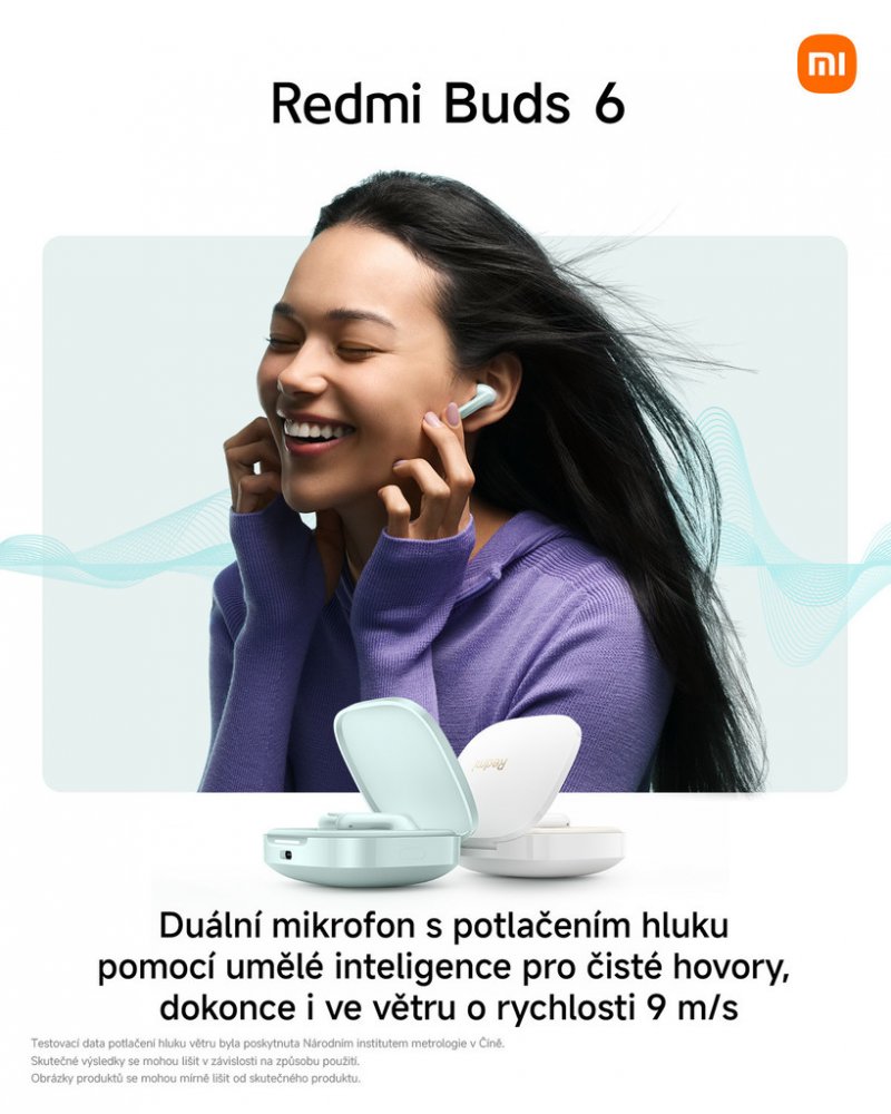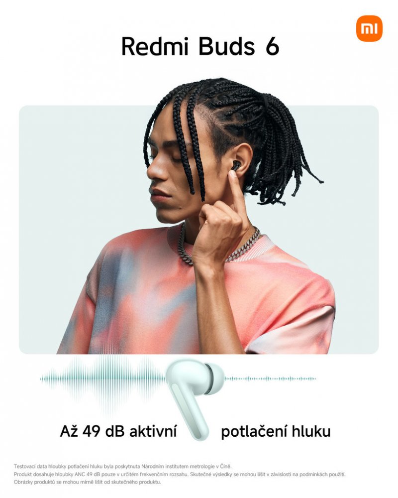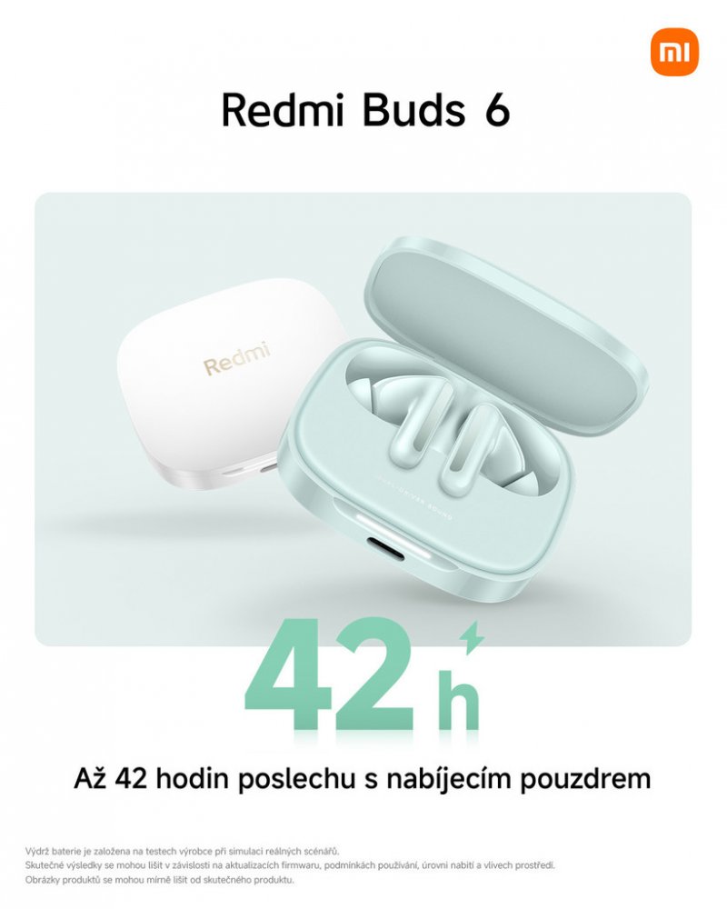 Sluchátka Redmi Buds 6 nabízejí Hi-Fi zvuk s duálními 12,4mm a 5,5mm měniči, aktivní potlačení hluku až do 49 dB a tři režimy průhlednosti. Podporují čtyři přednastavená nastavení ekvalizéru a personalizovanou funkci ANC. S nabíjecím pouzdrem poskytují až 42 hodin provozu a nabízejí rychlé nabíjení přes port USB-C.