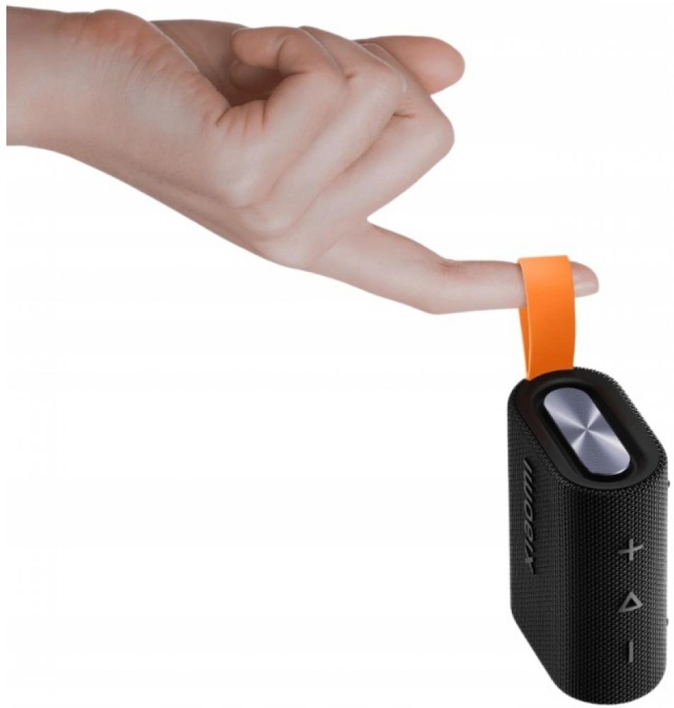 Minimalistický design reproduktoru je doplněn o výrazný černý odstín a oranžové detaily, které dávají produktu osobitý a moderní vzhled.