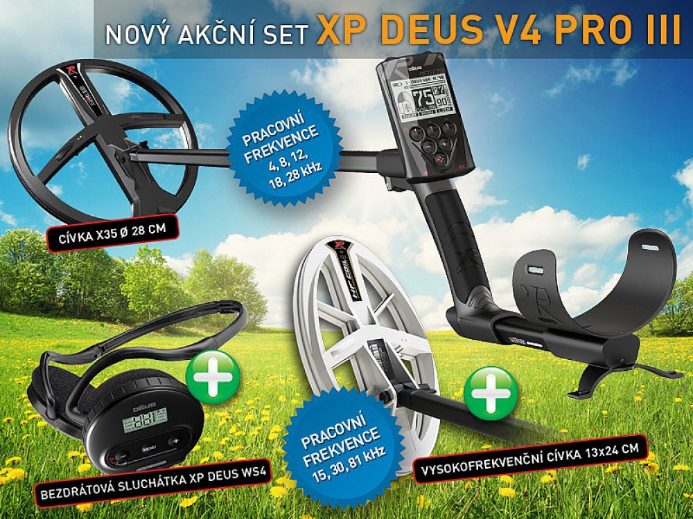 Set obsahuje Detektor XP DEUS se sluchátky, jednotkou a cívkou 28cm X35 + druhá cívka HF 13x24cm.