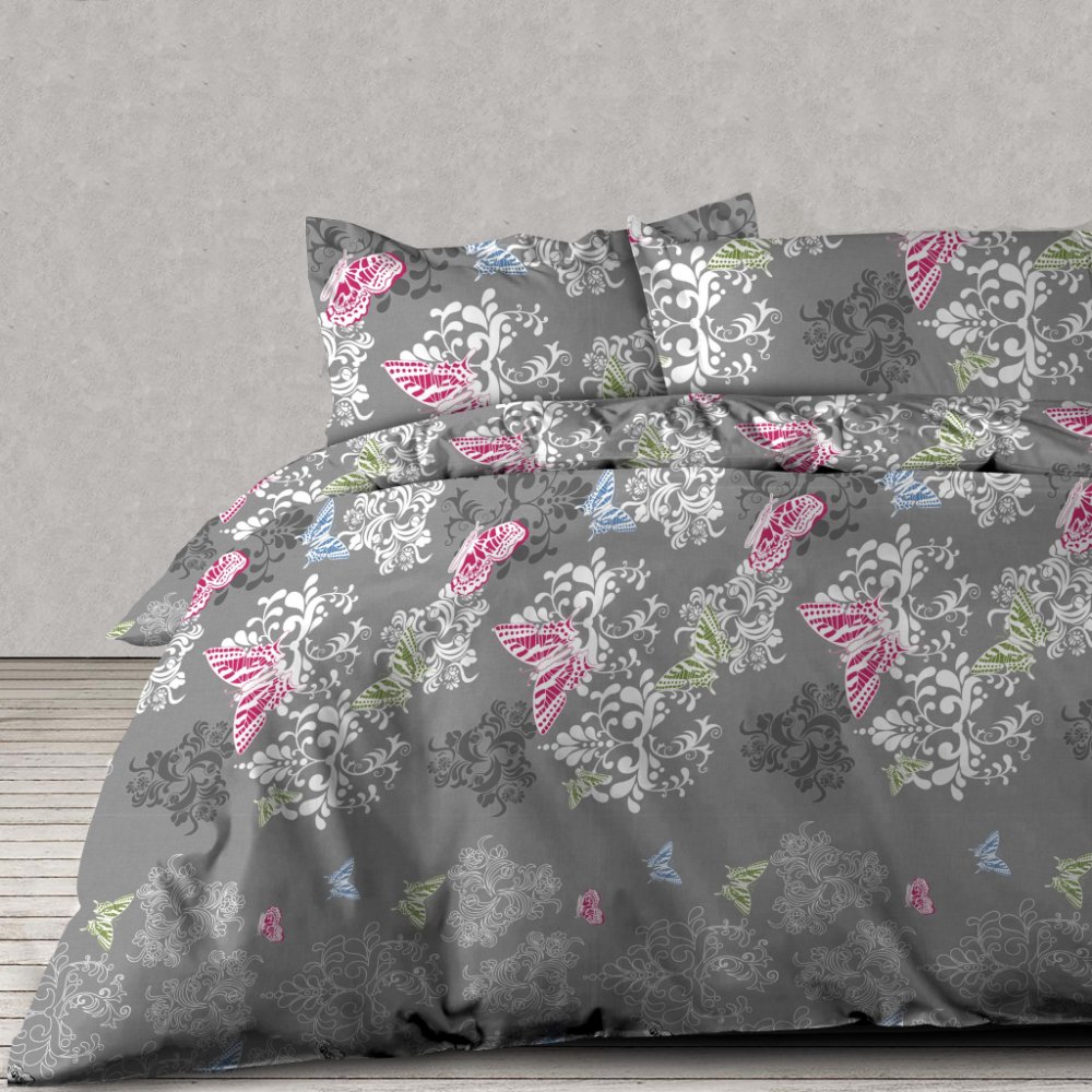 Povlečení DENISA s jemným vzorem motýlků potěší především romantiky. Rafinovaný podklad v šedé barvě nechá krásně vyniknout bílé i barevné vzory a s přehledem zaujmou v ložnici či pokojíku na první pohled. Materiál ze 100% bavlny přináší dobré absorpční vlastnosti, dlouhou životnost a na omak hebký povrch. A ve dne nezapomeňte na přehoz na manželskou postel, který vaše lůžkoviny dokonale ochrání. Využijte výhodný set 2+2 na dvě klasická lůžka.
