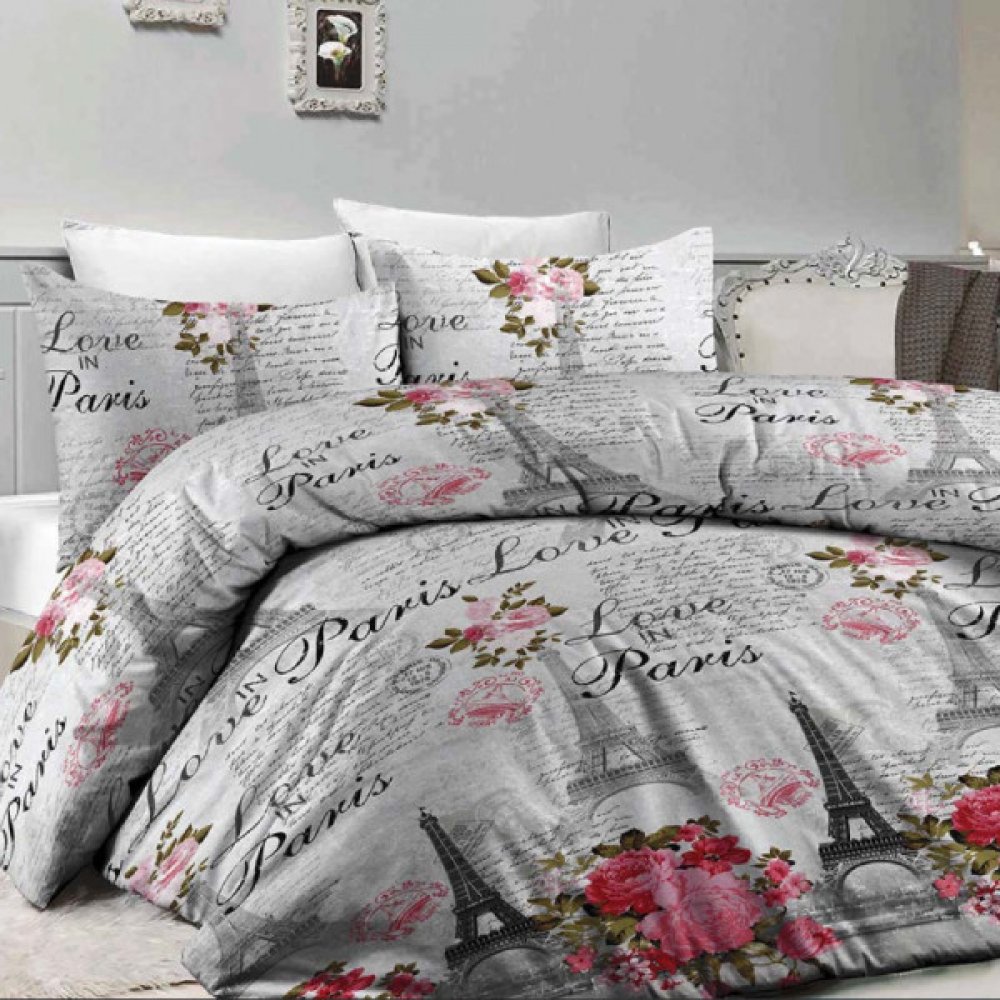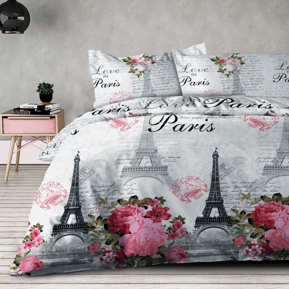 Bavlněné povlečení s romantickým vzorem PARIS vnese do každé ložnice či pokojíku tu správnou atmosféru a jedinečný šarm Francie. Na své si přijdou milovníci květin v růžové ve spojení s neodmyslitelnou Eiffelovou věží, jako symbolu zamilovaných, a to vše na rafinovaném šedém podkladu. Díky dobrým vlastnostem 100% bavlny Renforcé je povlečení příjemně prodyšné a hebké na omak s vynikající absorpcí vlhkosti. Tento textilní kousek zaručeně přispěje k dobré náladě a k pohodlnému spánku.