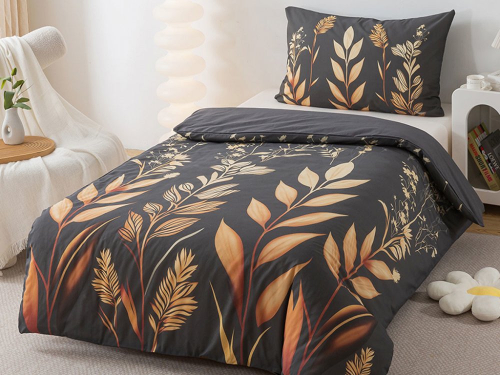 Černo - béžové povlečení KAMALA a moderní pojetí přírodních vzorů v hnědých tónech na tmavě šedé v podkladu je ideální volbou pro moderní i přírodně stylizovaný interiér ložnice či pokoje. Lehkost vzoru působí harmonicky a doprovází jej na dotek jemná, hladká bavlna. Renforcé povlečení je zhotoveno z kvalitní bavlny, která je odolná materiálem i barvou a s dlouhou životností se tato ložní souprava řadí mezi luxusní povlečení. Povlak na peřinu je ze spodní strany jednobarevný, povlak na polštář má potisk z obou stran.