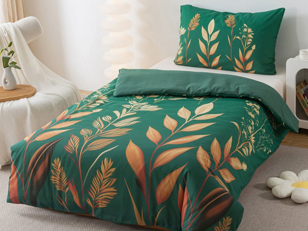 Zelené povlečení KAMALA a moderní pojetí přírodních vzorů v odstínech hnědé na zeleném podkladu je ideální volbou pro moderní i přírodně stylizovaný interiér ložnice či pokoje. Lehkost vzoru působí harmonicky a doprovází jej na dotek jemná, hladká bavlna. Renforcé povlečení je zhotoveno z kvalitní bavlny, která je odolná materiálem i barvou a s dlouhou životností se tato ložní souprava řadí mezi luxusní povlečení. Povlak na peřinu je ze spodní strany jednobarevný - zelený, povlak na polštář má potisk z obou stran. Set povlečení na jednolůžko pasuje na naši nabídku lůžkovin.