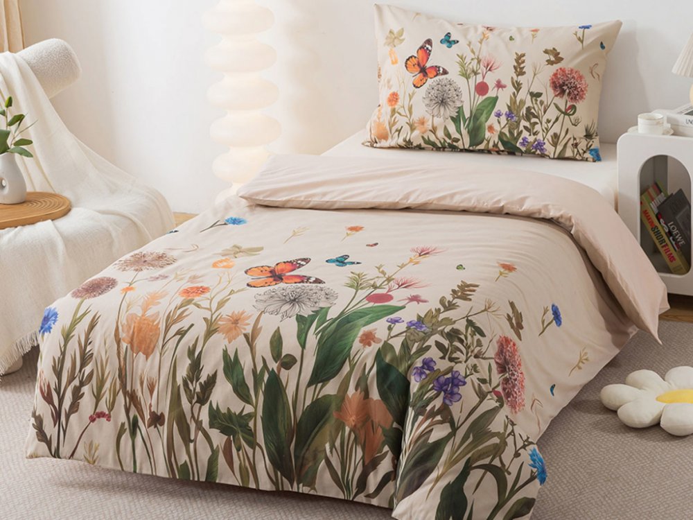 Nechte se okouzlit krásou letní rozkvetlé louky plné poletujících motýlků a povlečte si peřiny do povlečení z bavlny. Krásný vzor flóry osvěží interiér a jemná bavlna vám dopřeje klidný spánek a energická rána. Renforcé povlečení z bavlny je hladké a příjemné na dotek s dobrou savostí a odolností vůči opotřebení či ztrátě barvy. Povlak na přikrývku je na spodní straně jednobarevný, povlak na polštář má potisk z obou stran.Povlečení 140x200 cm skvěle pasuje na klasické přikrývky a polštáře 70x90 cm.