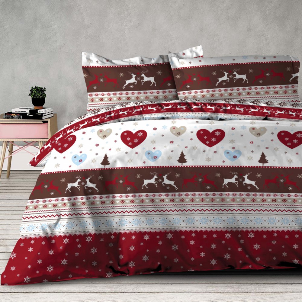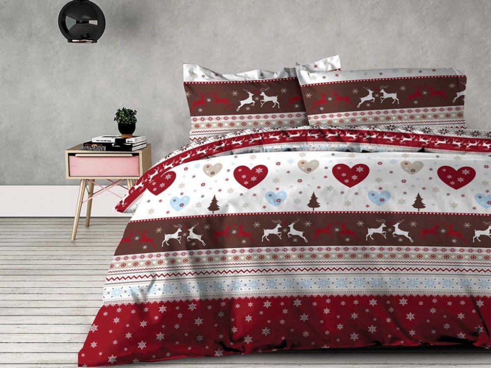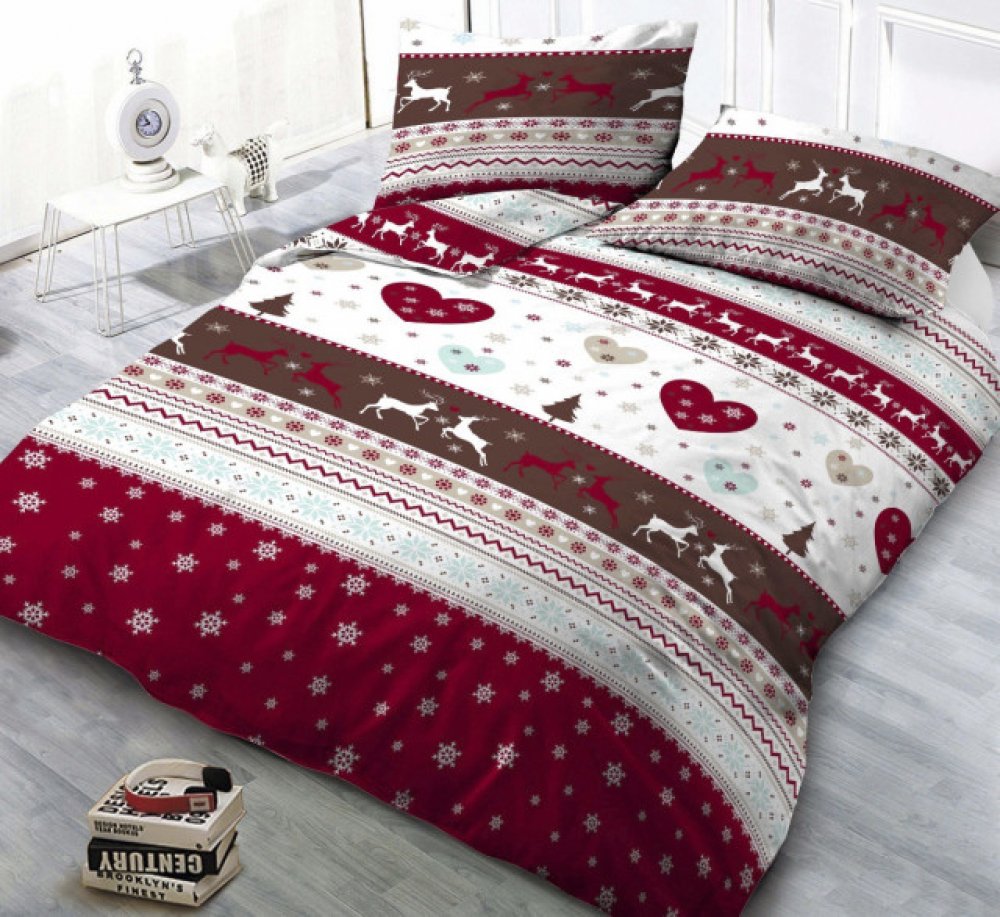 Flanelové vánoční povlečení se zimními motivy krásně zahřeje a rozzáří ložnici sváteční atmosférou. Kontrast dominantních barev červené, bílé a hnědé interiér příjmeně zharmonizuje. Na dotek hladký materiál ve 100% bavlně je dobře prodyšný a snadno se udržuje.