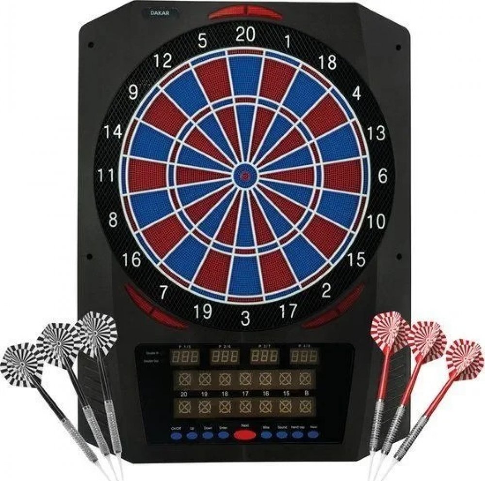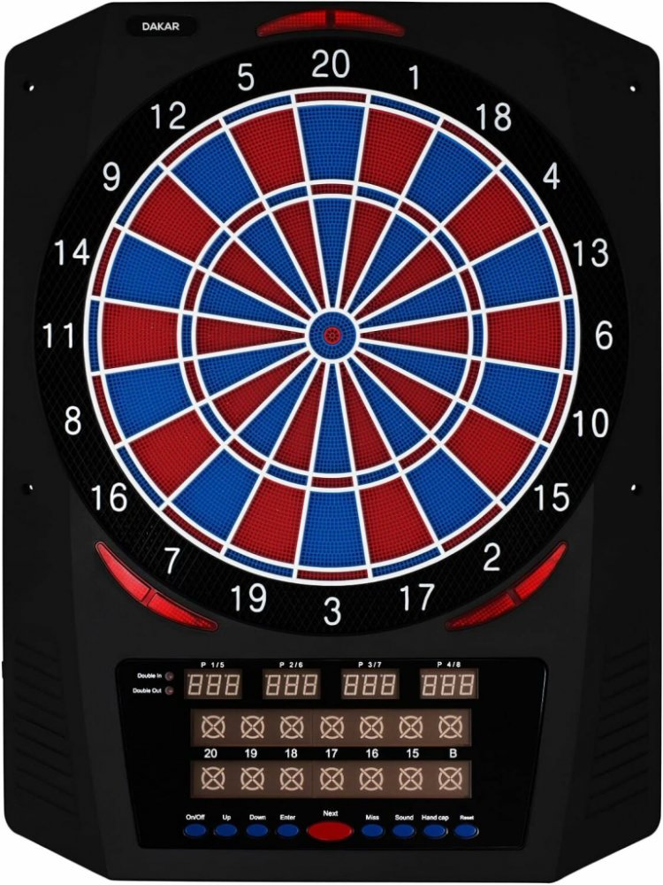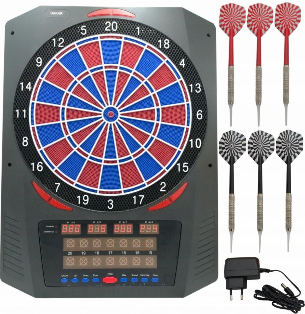 Elektronický terč na šipky XQ MAX Dakar, LED Elektronický terč na šipky Dakar má vše, co od elektronického terče očekáváte. Terč se prodává spolu se šipkami s plastovými hroty, takže můžete hned začít hrát! Kromě toho je terč vybaven různými hrami, takže se nikdy nebudete nudit. RŮZNÉ HRY Na terči lze hrát různé hry se šipkami. Vzpomeňte si na známé hry. 301, 501 a Kriket. Celkem je zde 36 různých her, které mají i variace. Na elektrickém terči může současně hrát 8 různých hráčů nebo týmů. Je také možné hrát sám proti počítači. KOMPLETNÍ SADA Elektronický terč je dodáván se 6 kompletními šipkami (2 sady) s plastovými hroty. Kromě toho je v balení 25 extra plastových hrotů. To proto, aby bylo možné poškozené hroty okamžitě vyměnit. ZDROJ Elektronický terč na šipky Dakar funguje z elektrické zásuvky pomocí adaptéru. Abyste ušetřili energii, terč se automaticky vypne, pokud se nepoužíval déle než 30 minut. TECHNICKÉ ÚDAJE Rozměry: 46 x 3 x 61 cm Počet hráčů: 1-8 hráčů Hra proti počítači: Ano Počet her: 36 her Počet variací hry: 580 Zvukové efekty: Ano Mluvené skóre: Ne Segmenty: 2-řádkové triple a double sektory Zdroj: Adaptér (součástí balení) Výrobce: XQ MAX Poznámka: Elektronický terč na šipky Dakar se může používat maximálně s 16 gramovými soft šipkami.