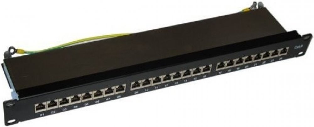 Propojovací panel, 24x port RJ-45 (kategorie Cat6), stíněný, narážecí kontakty, kovový nasazovací kryt na zadní části. Kontakty jsou na svorkovnici odlišeny barvami nebo číselně podle typu zapojení (T568A nebo T568B).