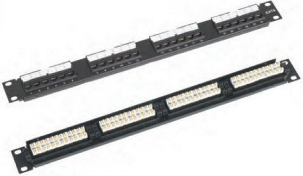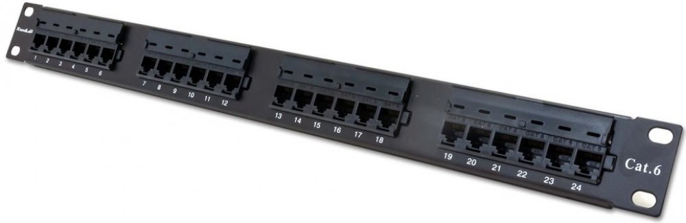 Propojovací panel, 24 portů RJ-45, CAT6, nestíněný, narážecí kontakty normal. Kontakty jsou na svorkovnici odlišeny barvami podle typu zapojení, a to buď podle T568A, nebo T568B nebo číselně značeny.