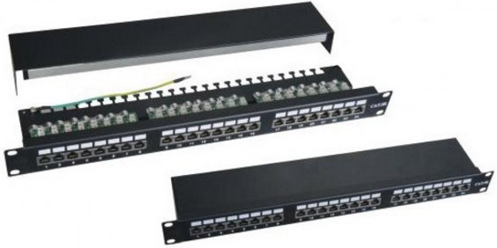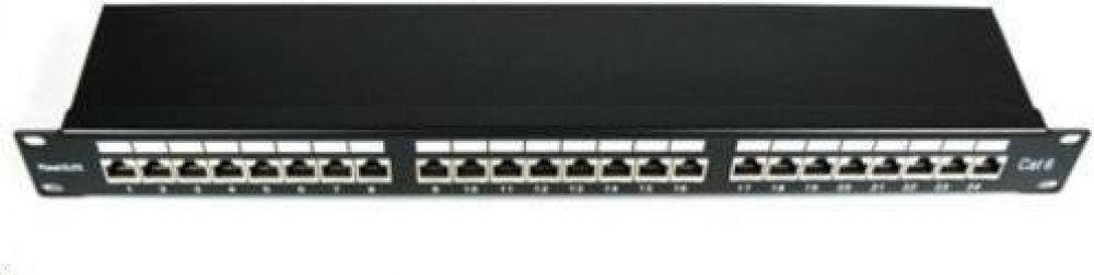 Propojovací panel, 24 portů RJ-45, CAT6, stíněný, 30u pozlacení, narážecí kontakty normal, celokovová konstrukce.