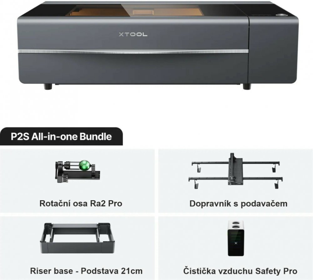 Kompletní sada xTool P2S - All in one Využijte maximální potenciál naší výhodné sady All in one. Sada obsahuje podstavu pro gravírování vyšších předmětů, rotační osu, dopravník s podavačem pro nadměrné materiály a čističku vzduchu.