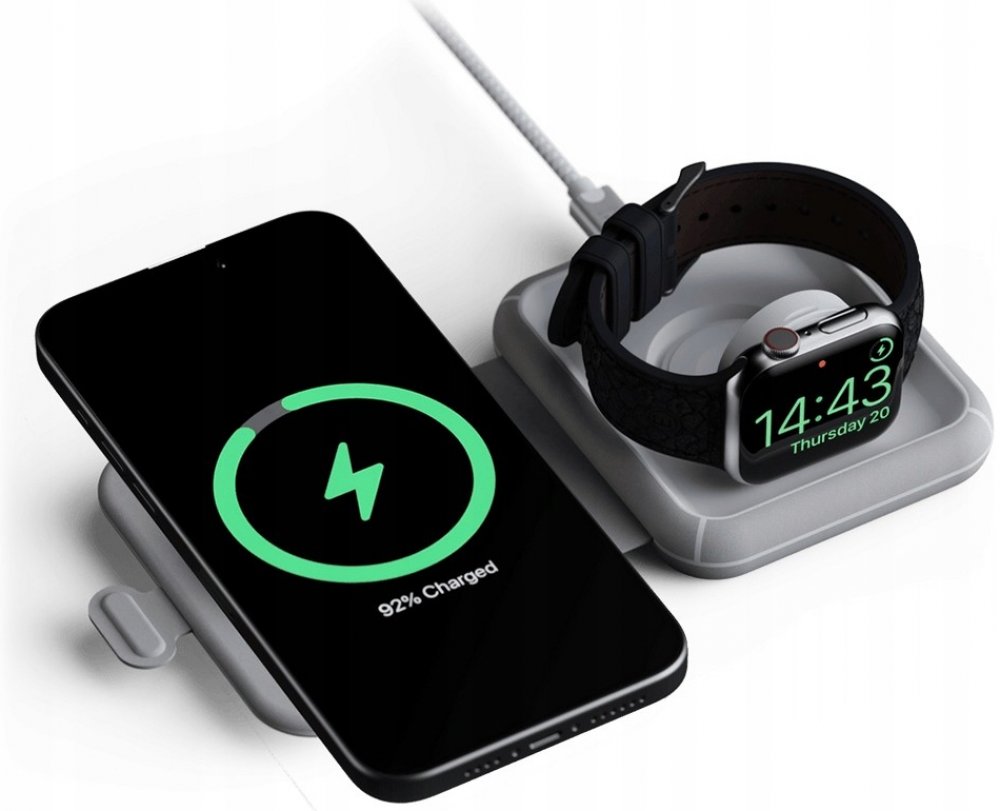 Stačí rozložit nabíječku, připojit k nejbližšímu adaptéru, umístit iPhone a Apple Watch na nabíjecí podložky. Nabíjení se spustí automaticky. Bezdrátové nabíjení je možné pro všechny smartphony kompatibilní s MagSafe nebo Qi.