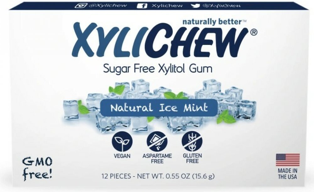 Ice Mint Xylichew žvýkačky s gumovým základem bez plastových materiálů, bez cukru, bez aspartamu a bez ostatních umělých sladidel, bez GMO, bez lepku, vegan.