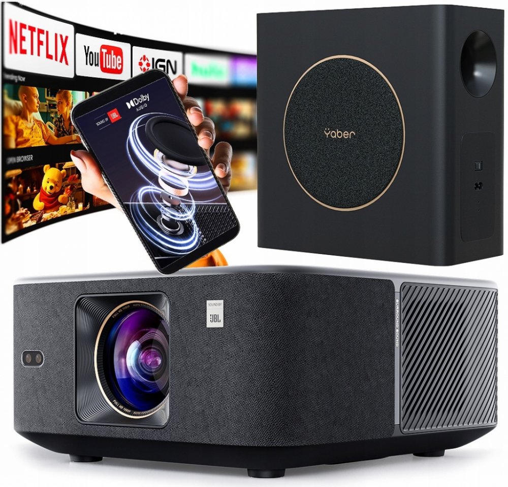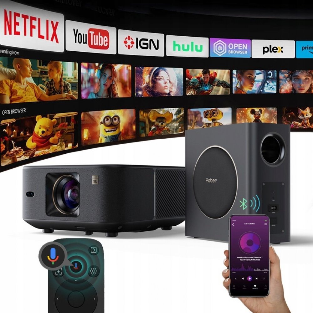 Yaber K3 je chytrý projektor s externím subwooferem, Full HD 1080p se svítivostí 1600 ANSI lumenů, nabízející automatickou korekci obrazu, reproduktory JBL s Dolby Audio a vestavěnou platformu Google TV. Konektivita: BT 5.0, WiFi6, NFC.
