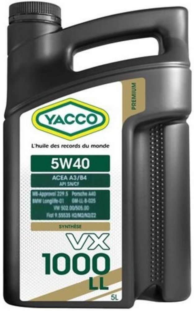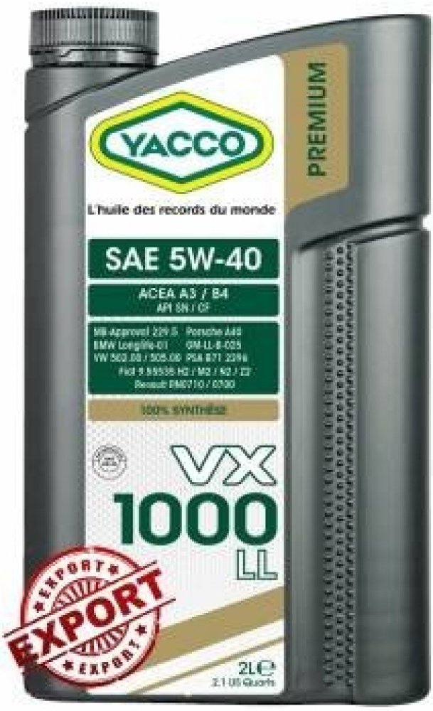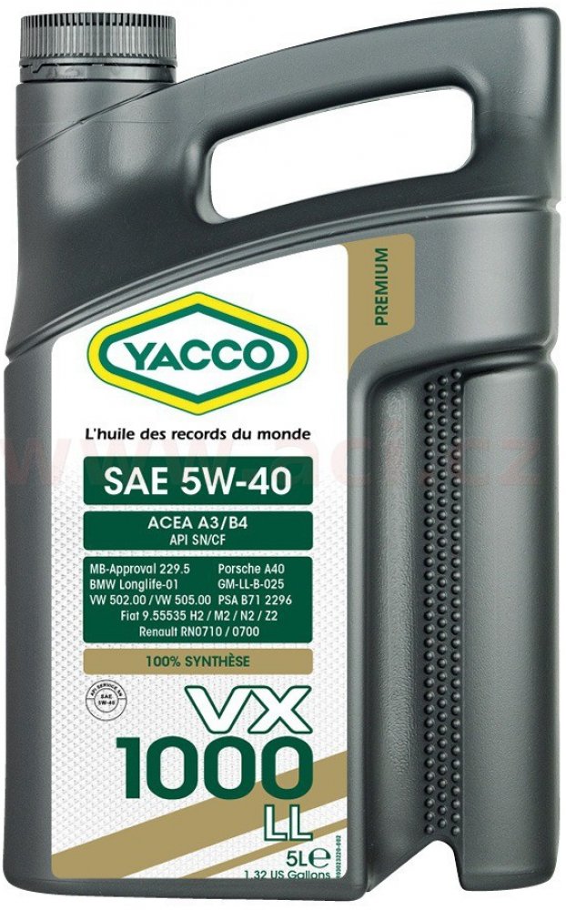 Popis: Plně syntetický motorový olej pro moderní osobní a lehké dodávkové automobily. Yacco VX 1000 LL 5W40 je vhodný pro vysoce namáhané benzínové motory (bez ohledu na to, zda jsou přeplňované) a dieselové motory s přímým vstřikováním (včetně přeplňovaných). Vhodný pro vozy na LPG s nebo bez katalyzátoru. Lze používat za náročných provozních podmínek (dálnice, hustá městská doprava). Vlastnosti: Specifická hmotnost při 20°C kg/m3 852 Viskozita při 40°C mm2/s 88 Viskozita při 100°C mm2/s 14,5 Viskozitní index 172 Bod tuhnutí °C -45 Bod vzplanutí °C 230 Viskozita, dynamická při -30°C mPa.s 5900 HTHS viskozita (150°C) 3,7 Výhody: - 100% syntetiský olej, jeden z nejlepších 5w40 na trhu. - Vynikající stabilita při vysokých teplotách a smykové odolnosti. - Vynikající parametry při nízkých teplotách. - Vynikající detergentní / dispergační vlastnosti. - Poskytuje vynikající výkon s vysokou spolehlivostí motoru. - Okamžitá ochrana motoru proti opotřebení při nastartování. - Udržuje motor v čistotě i při použití v náročných prostředích.